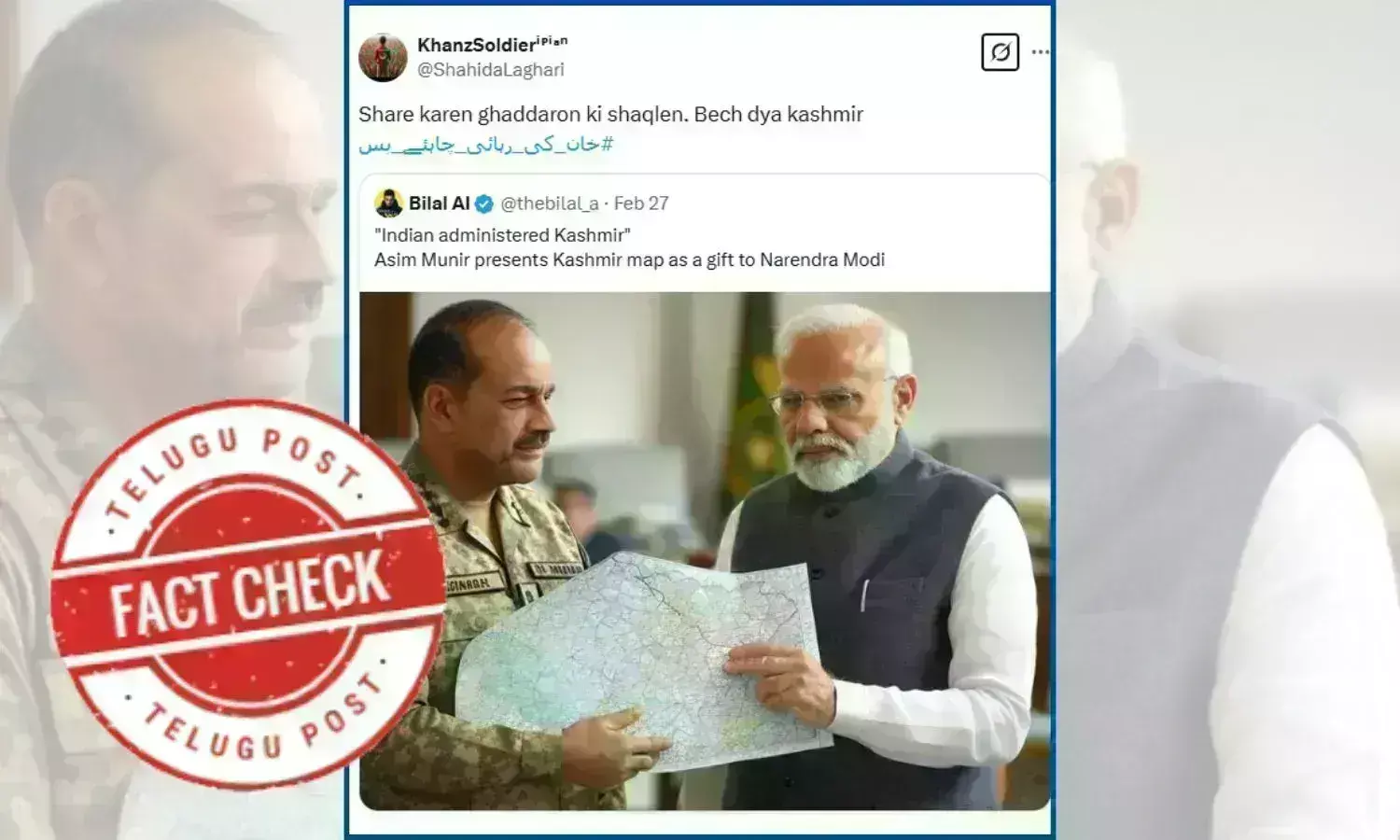 Meanwhile, an image showing Pakistan’s Army Chief Asim Munir and Indian Prime Minister Narendra Modi is shared on social media platforms with the claim that the Pakistani Army Chief is presenting the Kashmir map as a gift to Indian PM Narendra Modi. This image was shared by an X user with the caption ‘Share karen ghaddaron ki shaqlen. Bech diya Kashmir.