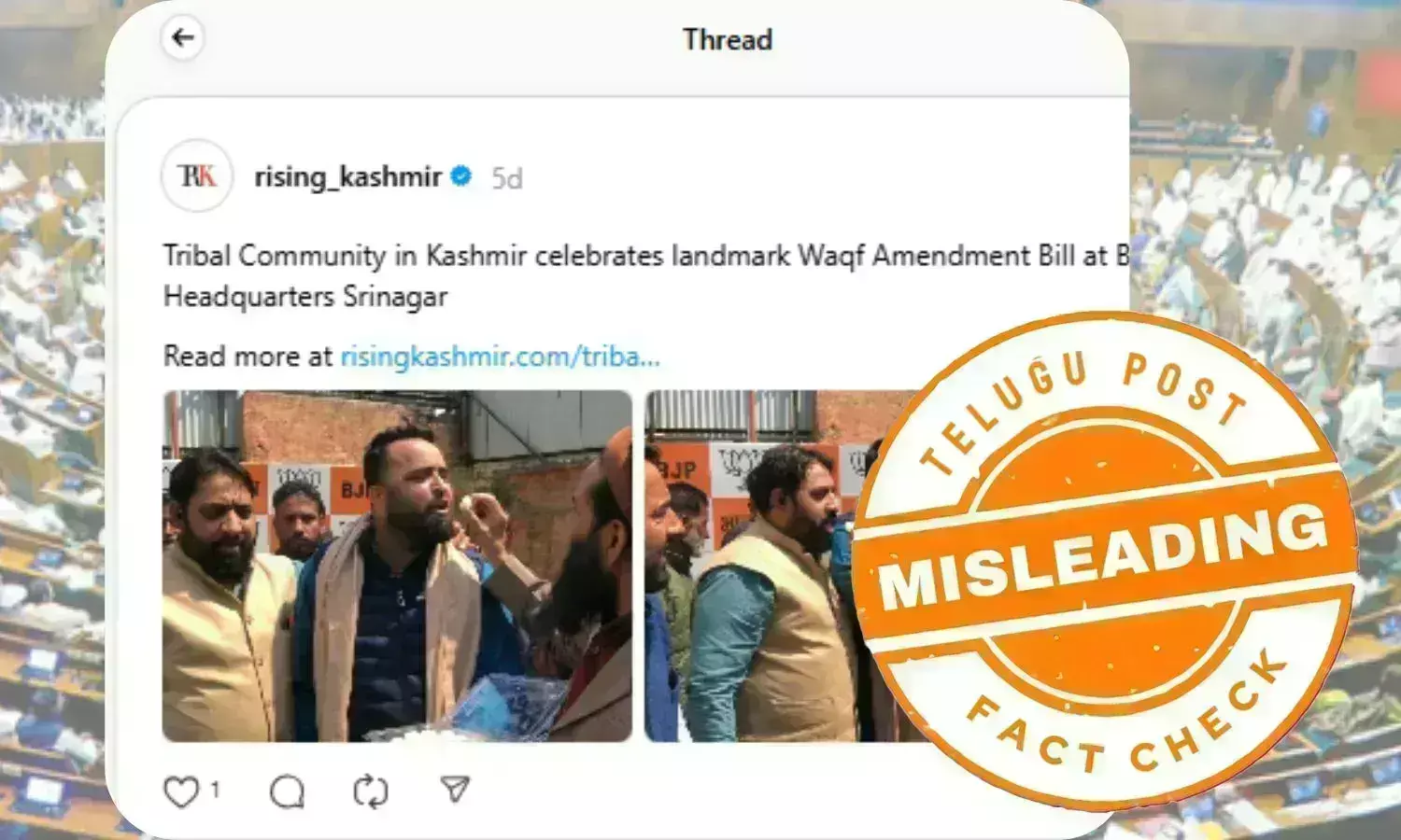 مقامی نیوز پورٹل نے اپنی ٹوئیٹ میں دعویٰ کیا تھا "وادی کی 'قبائیلی برادری' نے سری نگر میں واقع بی جے پی صدر دفتر پر تاریخی وقف (ترمیمی) بل پاس کئے جانے پر جشن منایا۔ " اور ساتھ میں انگریزی آرٹیکل کا لنک بھی شئیر کیا تھا۔