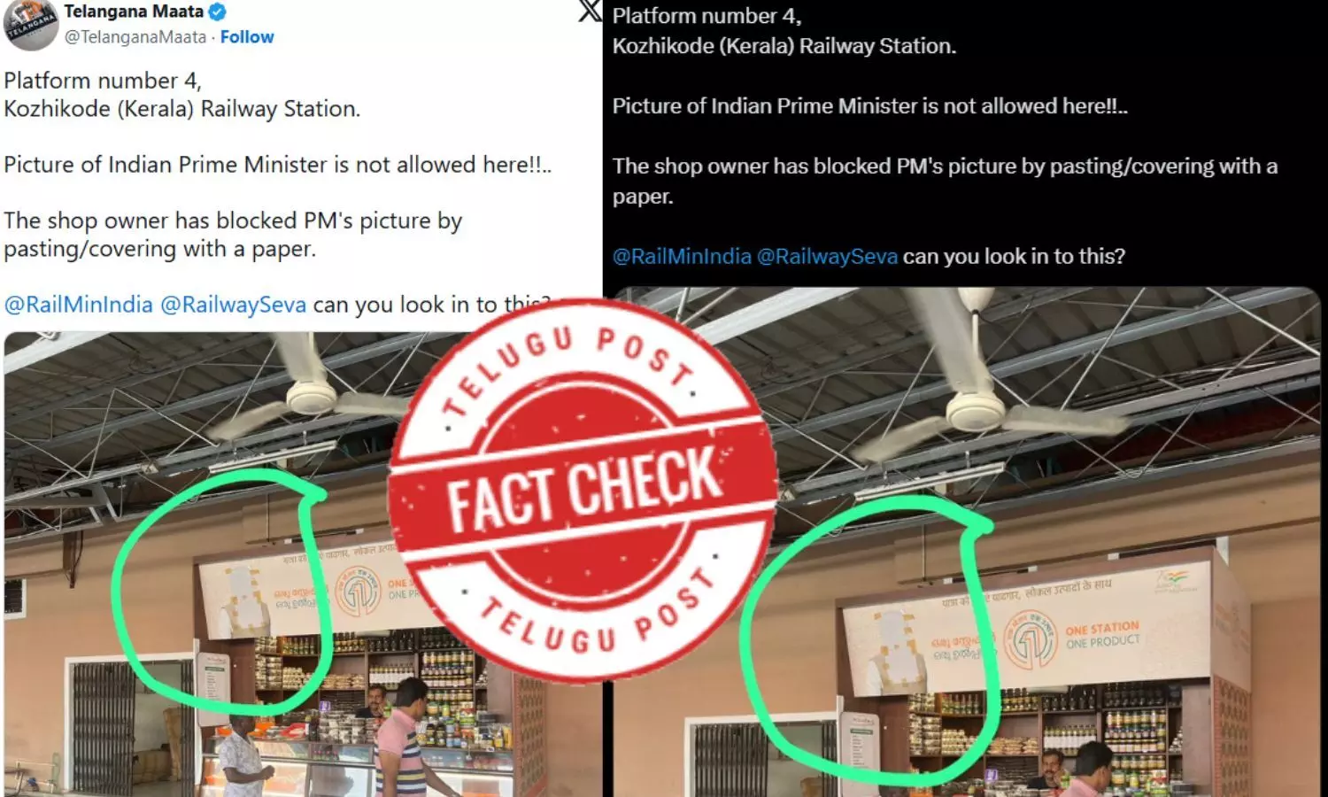 అలాంటి ట్వీట్లపై పాలక్కాడ్ డివిజన్ రైల్వే అధికారులు కూడా స్పందించారు. ఇది పాత చిత్రమని జులై 31, 2024న కూడా స్పష్టం చేశారు. 2024 సార్వత్రిక ఎన్నికల సమయంలో మోడల్ కోడ్ ఆఫ్ కండక్ట్ (MCC)ని అనుసరించి మోదీ ముఖాన్ని కప్పి ఉంచారని వివరించారు. అదనంగా, అధికారులు కాలికట్ రైల్వే స్టేషన్లోని OSOP స్టాల్ ప్రస్తుత చిత్రాన్ని పంచుకున్నారు, అక్కడ మోదీ చిత్రం కనిపిస్తుంది.