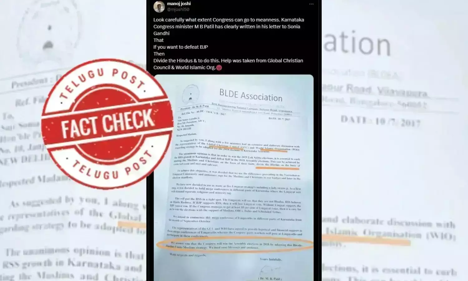 یہ خط مئی 2024 میں اس کیپشن کے ساتھ شئیر کیا جارہا ہے۔ اس میں لکھا ہے کہ "غور سے دیکھیں کہ کانگریس کس حد تک ظالم ہو سکتی ہے۔ کرناٹک کانگریس کے وزیر ایم بی پاٹل نے سونیا گاندھی کو لکھے اپنے خط میں واضح طور پر لکھا ہے کہ اگر آپ بی جے پی کو الیکشن میں ہرانا چاہتی ہیں تو ہندوؤں کو تقسیم کریں اورایسا کرنحے میں گلوبل کرسچن کونسل اور ورلڈ اسلامک آرگنائزیشن سے مدد لی گئی۔"