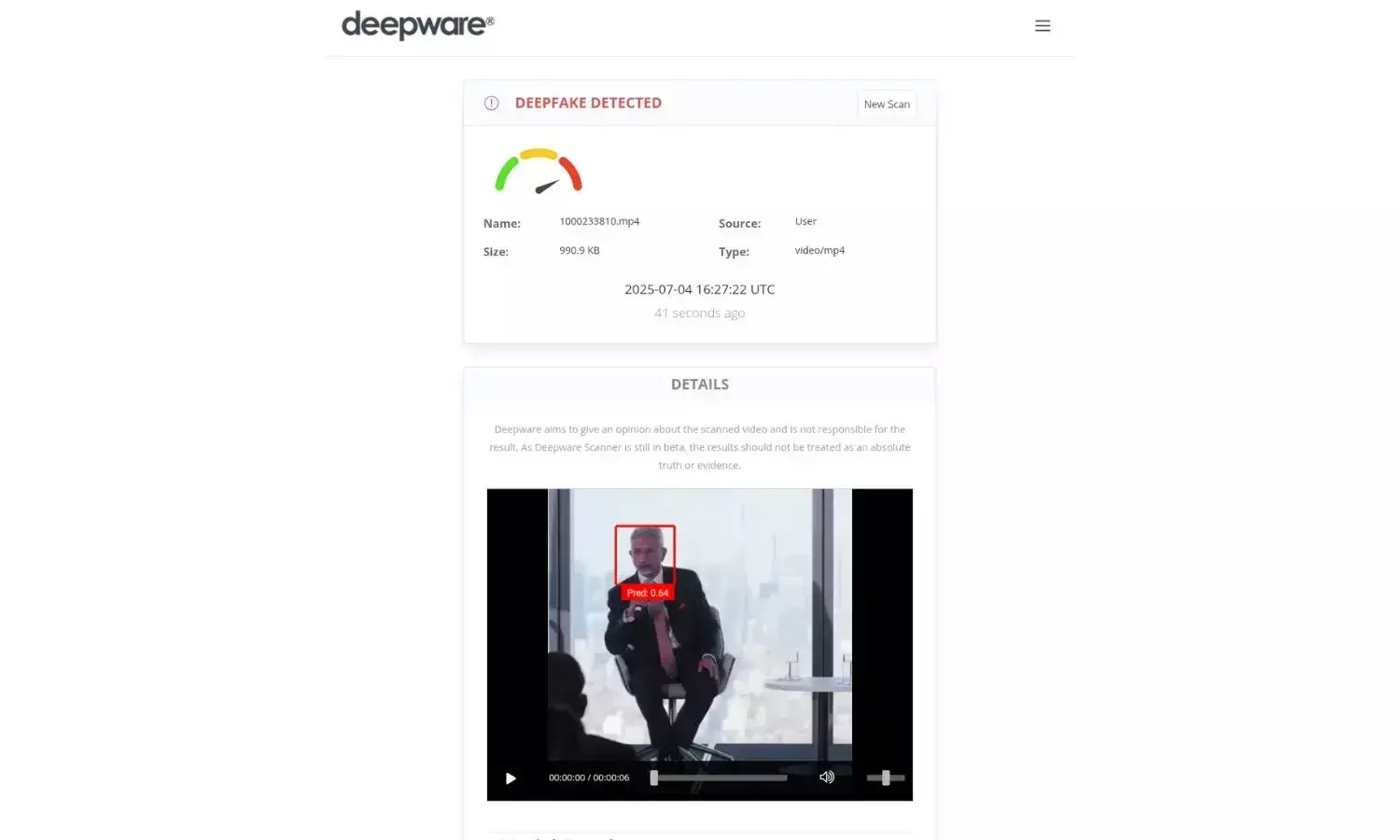 ഡീപ് ഫേക്കിലൂടെ ശബ്ദം കൂട്ടിച്ചേർത്തതാണോ എന്നറിയാൻ ഡീപ് വെയർ എഐ സ്കാന്നർ എന്ന എഐ ഡിറ്റക്ഷൻ പേജിലൂടെ പരിശോധിച്ചു. കൂട്ടിച്ചേർത്തതായി സൂചന ലഭിച്ചു ഭാഗമാണ് പരിശോധിച്ചത്. ഡീപ് ഫേക്കിലൂടെ മാറ്റം വരുത്തിയതാണെന്ന് വ്യക്തമായി.
