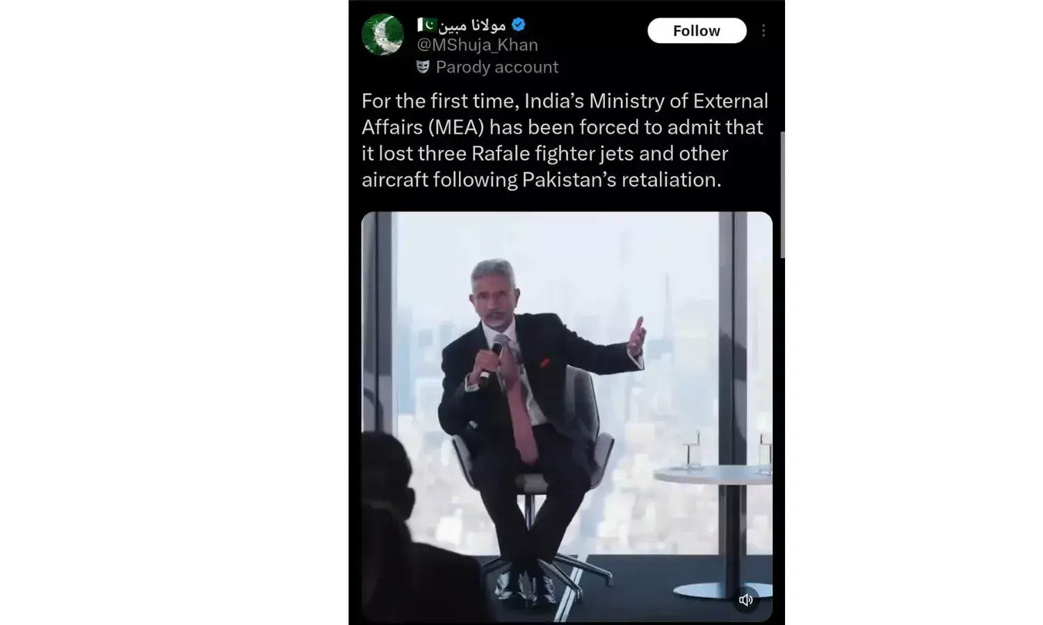 പഹൽഹമിൽ വിനോദ സഞ്ചാരികൾക്ക് നേരെയുണ്ടായ ഭീകരാക്രമണത്തിന് പിന്നാലെ ഇന്ത്യ പാകിസ്താനിലെ ഭീകര കേന്ദ്രങ്ങൾ ലക്ഷ്യമിട്ട് നടത്തിയ പ്രത്യാക്രമണത്തിൽ ഇന്ത്യയുടെ റഫാൽ വിമാനങ്ങൾ തകർത്തെന്നാണ് പാകിസ്താൻ വാദം. എന്നാൽ റഫാൽ തകർന്നിട്ടില്ലിന്നാണ് മാതൃ കമ്പനിയായ ഡിസോൾട് ഏവിയേഷൻ സിഇഒ എറിക് ട്രാപ്പിയേർ പറഞ്ഞത്. അതിനിടെ റഫാൽ തകർന്നെന്ന് ഇന്ത്യൻ വിദേശകാര്യ മന്ത്രാലയം സമ്മതിച്ചെന്ന അവകാശ വാദത്തോടെ ഒരു വീഡിയോ സമൂഹ മാധ്യമങ്ങളിൽ പ്രചരിക്കുകയാണ്. 19 സെക്കൻ്റ് ദൈർഘ്യമുള്ള വീഡിയോയിൽ വിദേശ കാര്യ മന്ത്രി എസ് ജയശങ്കർ ഇന്ത്യ പാകിസ്താൻ സംഘർഷത്തിൽ ഇന്ത്യയ്ക്ക് മൂന്ന് റഫാൽ വിമാനങ്ങൾ നഷ്ടപ്പെട്ടതായി പറയുന്നത് കാണാം. തുടർന്ന് പാകിസ്താൻ നടത്തിയ ആക്രമണം അനീതിയാണെന്നും പറയുന്നുണ്ട്. പിന്നീട് അമേരിക്കൻ വിദേശാകാര്യ സെക്രട്ടറി മാർക്കോ റൂബിയോ പാകിസ്താൻ ചർച്ചയ്ക്ക് തയാറാണെന്ന് അറിയിച്ചതായും പറയുന്നതാണ് വീഡിയോയിൽ ഉള്ളത്. പാകിസ്താന്റെ പ്രത്യാക്രമണത്തെ തുടർന്ന് മൂന്ന് റാഫേൽ യുദ്ധവിമാനങ്ങളും മറ്റ് ഫൈറ്റർ ജെറ്റുകളും നഷ്ടപ്പെട്ടുവെന്ന് ആദ്യമായി സമ്മതിക്കാൻ ഇന്ത്യയുടെ വിദേശകാര്യ മന്ത്രാലയം (എംഇഎ) നിർബന്ധിതമായി എന്ന വിവരണത്തോടെയാണ് പോസ്റ്റുകൾ. പോസ്റ്റും ലിങ്കും ചുവടെ: