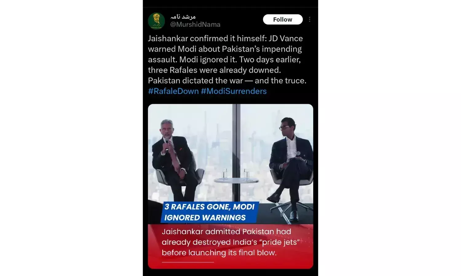 ഓപ്പറേഷൻ സിന്ദൂരിൽ പാകിസ്താൻ ഇന്ത്യയുടെ റഫാൽ യുദ്ധ വിമാനങ്ങൾ തകർത്തെന്ന് ഇന്ത്യൻ വിദേശകാര്യ മന്ത്രാലയം സമ്മതിച്ചെന്ന സമൂഹ മാധ്യമങ്ങളിലെ പ്രചാരണം വ്യാജമാണെന്ന് കണ്ടെത്തി. ന്യൂസ് വീക്ക് സിഇഒ ദേവ് പ്രഗാദുമായുള്ള വിദേശകാര്യ മന്ത്രി എസ്. ജയശങ്കറിൻ്റെ അഭിമുഖത്തിലെ പ്രതികരണത്തിൽ എഡിറ്റ് ചെയ്ത് പ്രസ്തുത ഭാഗം കൂട്ടിച്ചേർത്താണ് പ്രചാരണം എന്ന് കണ്ടെത്തി