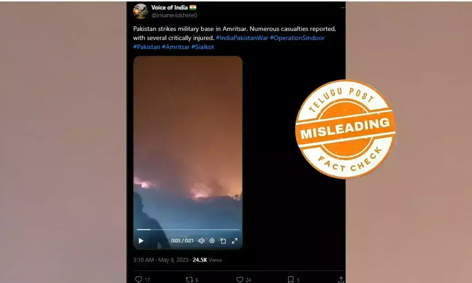 അതിനിടെ അമൃത്സറിലെ സൈനിക കേന്ദ്രത്തിൽ പാകിസ്താൻ ആക്രമണം നടത്തിയെന്ന അവകാശപ്പെട്ട് വീഡിയോ സമൂഹ മാധ്യമങ്ങളിൽ പ്രചരിക്കുകയാണ്. പൊട്ടിത്തെറിക്കൊപ്പം തീപടരുന്ന ദൃശ്യം,അമൃത്സറിലെ സൈനികതാവളത്തിൽ പാകിസ്താൻ ആക്രമണത്തിൽ നിരവധി പേർക്ക് പരിക്കേറ്റെന്ന വിവരണത്തോടെയാണ് പ്രചരിക്കുന്നത്. പോസ്റ്റും ലിങ്കും ചുവടെ