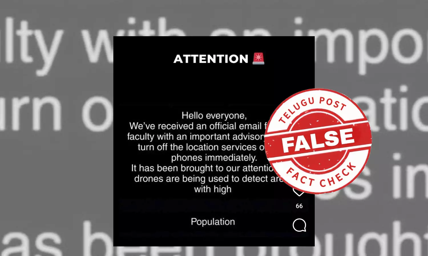 ଇତିମଧ୍ୟରେ ଏକ ଲେଖା ସୋସିଆଲ ମିଡିଆରେ ଭାଇରାଲ ହେବାରେ ଲାଗିଛି । ଉକ୍ତ ଲେଖାରେ ଉଲ୍ଲେଖ ରହିଛି, 'ATTENTION Hello everyone, We’ve received an official email from the faculty with an important advisory: please turn off the location services on your phones immediately. It has been brought to our attention that drones are being used to detect areas with high Population.’