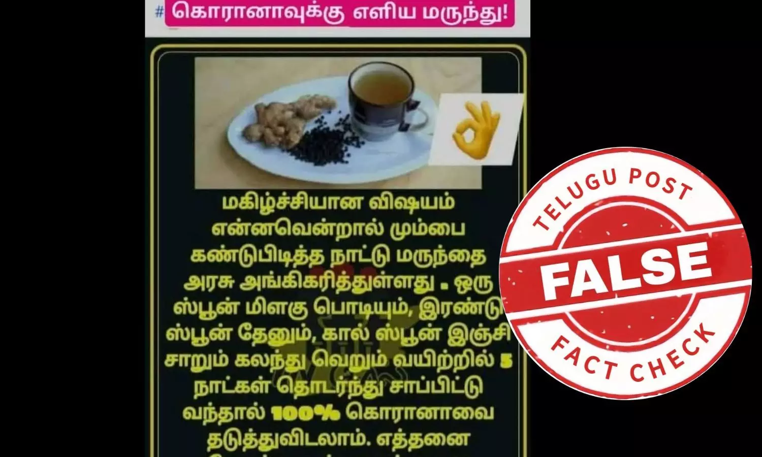 மிளகு, இஞ்சி, தேன் கலந்து தயாரிக்கப்பட்ட கொரோனா நாட்டு மருந்துக்கு அரசு அங்கீகாரம் தந்துள்ளதாக பரவும் தகவல் தவறானது. அதுபோன்ற எந்த மருந்துக்கும் மத்திய அரசோ, மாநில அரசோ அங்கீகாரம் வழங்கவில்லை. தகவல்களை வெளியிடும் போது உண்மைத் தன்மையை சரிபார்த்து வெளியிடும்படி Telugupost உண்மை கண்டறியும் குழு கேட்டுக்கொள்கிறது.
