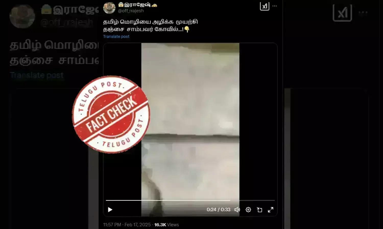 இது தொடர்பாக எக்ஸ் பயனர் (இராஜேஷ் / @off_rrajesh) பதிவில், “தமிழ் மொழியை அழிக்க முயற்சி. தஞ்சை சாம்பவர் கோயில்...!” என்று குறிப்பிடப்பட்டிருந்தது. அதனுடன் வைரல் வீடியோவும் இணைக்கப்பட்டிருந்தது.