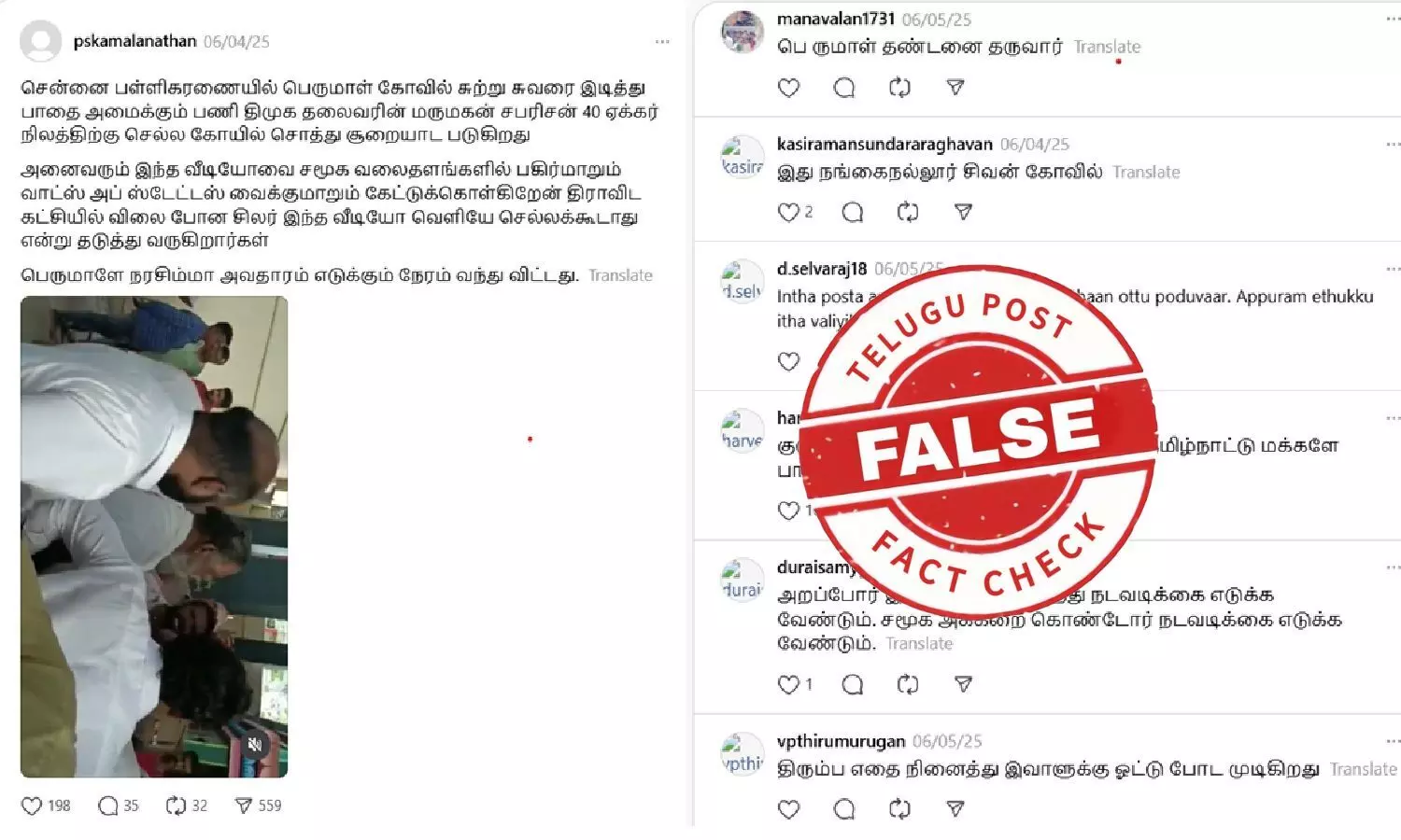 சென்னை பள்ளிகரணை பகுதியில் இருக்கின்ற பெருமாள் கோவிலின் சுற்றியுள்ள மதில் சுவரை இடித்துப் புதிய பாதை அமைக்கும் பணியின் வழியாக திமுக தலைவரின் 40 ஏக்கர் நிலத்திற்கு செல்ல வழி ஏற்படுத்தவே கோவில் சொத்து சூறையாடப்படுகிறது என்ற செய்தி இணைய தளங்களில் பரவி வருகிறது. இதுபோன்று கோவில் நிலங்கள் பரிபோனால் இந்து தெய்வங்களுக்கு கோவில்களே இல்லாமல் போய்விடும் என்ற கருத்துக்கும் இதற்கூடவே சேர்ந்து பகிரப்படுகிறது.