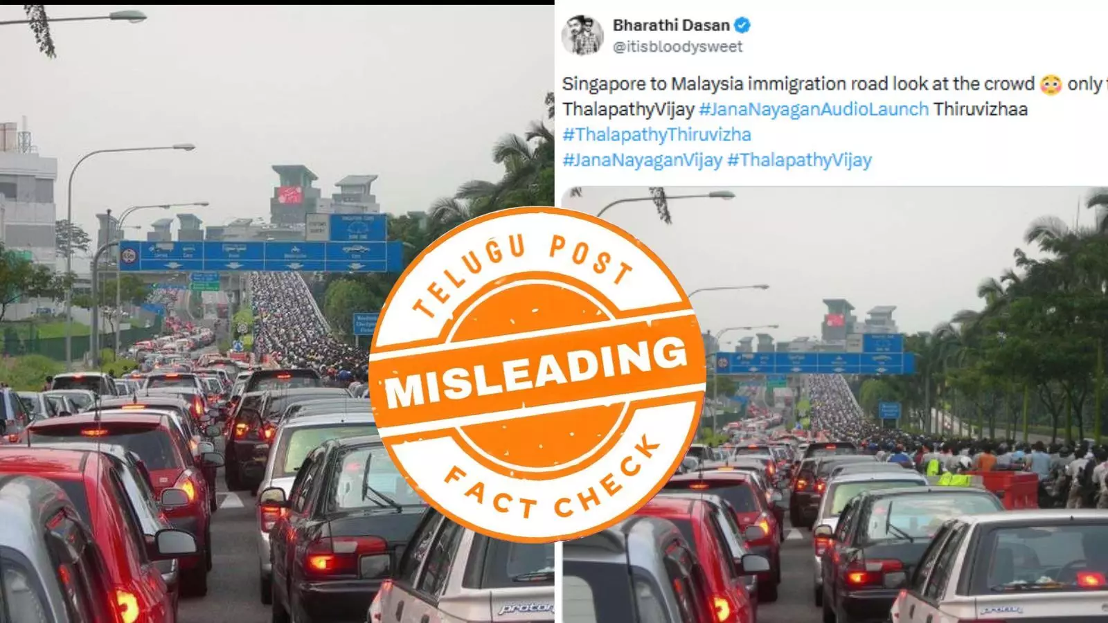 விஜய் வருகையால் சிங்கப்பூர் - மலேசியா சாலையில் அதிகப்படியான போக்குவரத்து நெரிசல் என தவறான தகவலுடன் புகைப்படம் பரவுகிறது. உண்மையில் அந்த புகைப்படம் 2017ஆம் ஆண்டு முதலே பகிரப்பட்டு வருகிறது என்பது தகுந்த ஆதாரங்களுடன் நிரூபிக்கப்பட்டு உள்ளது. ஆகவே, செய்திகளை வெளியிடும்போது அதன் உண்மைத் தன்மையை ஆராய்ந்து வெளியிடும்படி TeluguPost உண்மை கண்டறியும் குழு கேட்டுக்கொள்கிறது.