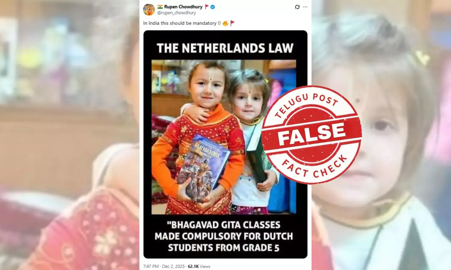 ഡച്ച് വിദ്യാർത്ഥികൾക്ക് അഞ്ചാം ക്ലാസ് മുതൽ ഭഗവത് ഗീത ക്ലാസുകൾ നിർബന്ധമാക്കിയെന്ന പ്രചാരണം വ്യാജമാണെന്ന് കണ്ടെത്തി. നെതർലാൻഡ്സിലെ വിദ്യാർഥികൾക്കായി സർക്കാർ നിശ്ചയിച്ച നിർബന്ധ വിഷയങ്ങളിൽ ഭഗവത് ഗീതയില്ല.