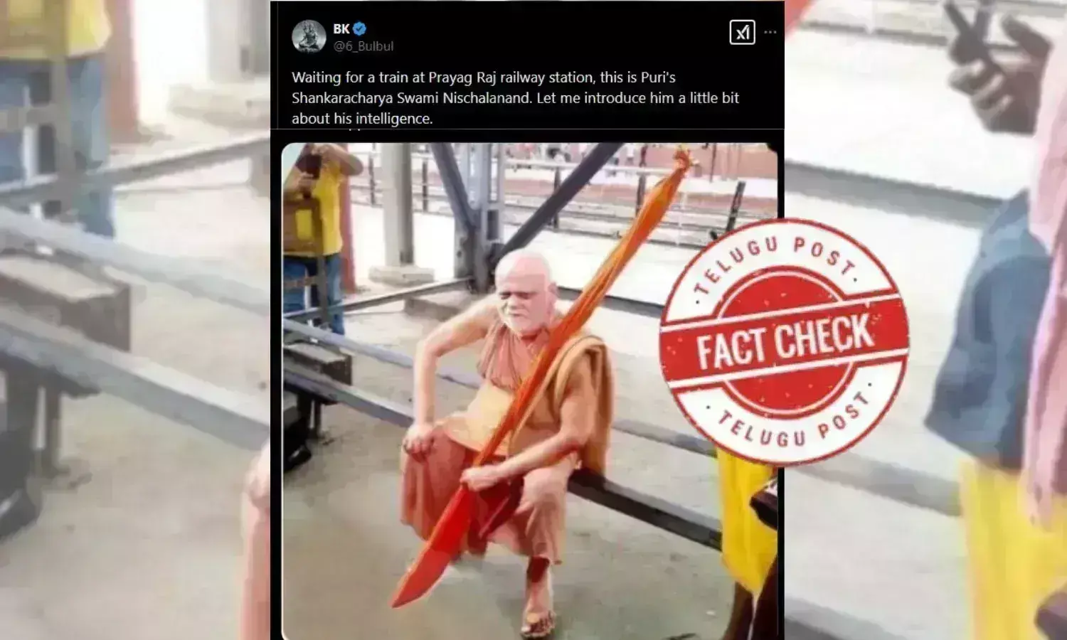 പ്രയാഗ് രാജിലെ റെയിൽവെ സ്റ്റേഷനിൽ കാത്തിരിക്കുന്ന പുരി ശങ്കരാചാര്യൻ എന്ന അടിക്കുറിപ്പോടെ പ്രചാരണം