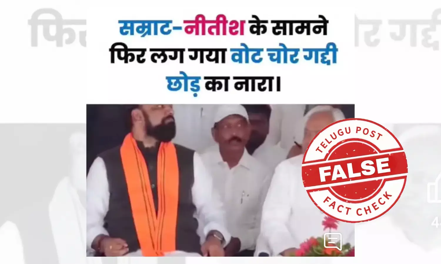 ଇତିମଧ୍ୟରେ ଏକ ଭିଡିଓ ସୋସିଆଲ ମିଡିଆରେ ଭାଇରାଲ ହେବାରେ ଲାଗିଛି । ଭିଡିଓରେ ବିହାର ମୁଖ୍ୟମନ୍ତ୍ରୀ ଏବଂ ଉପ ମୁଖ୍ୟମନ୍ତ୍ରୀ ଗୋଟିଏ ମଞ୍ଚରେ ବସିଥିବାର ଦେଖିବାକୁ ମିଳିଛି । ଭିଡିଓରେ କିଛି ନାରାବାଜି ମଧ୍ୟ ଶୁଣା ଯାଉଛି । କିଛିବ୍ୟକ୍ତି ଭୋଟ ଚୋର ଗାଦି ଛାଡ଼ ବୋଲି ହିନ୍ଦୀରେ କହୁଥିବାର ଶୁଣାଯାଉଛି । ଭିଡିଓ ଉପରେ ଉଲ୍ଲେଖ ରହିଛି, ସମ୍ରାଟ ଏବଂ ନୀତିଶଙ୍କ ଆଗରେ ପୁଣି ଲାଗିଲା ଭୋଟଚୋରି ନେଇ ନାରାବାଜି ।
