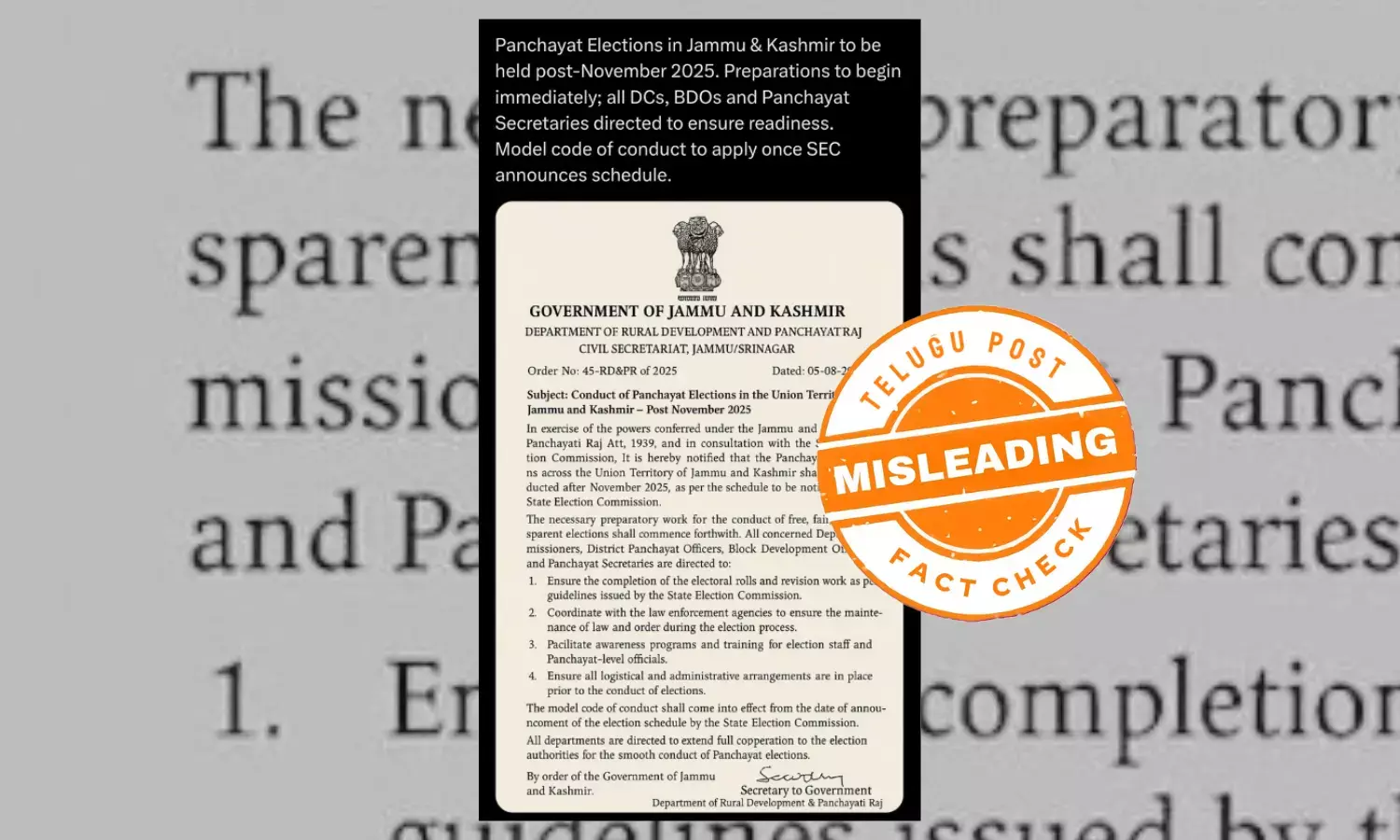 ଇତିମଧ୍ୟରେ ଏକ ଗ୍ରାଫିକ୍ସ ଯାହାକି ଏକ ନୋଟିସ ଭଳି ଦୃଶ୍ୟମାନ ହେଉଛି ସୋସିଆଲ ମିଡିଆରେ ଭାଇରାଲ ହେବାରେ ଲାଗିଛି । ଉକ୍ତ ନୋଟିସରେ ଜମ୍ମୁ ଏବଂ କାଶ୍ମୀରରେ ପଞ୍ଚାୟତ ନିର୍ବାଚନର କାର୍ଯ୍ୟସୂଚୀ ଘୋଷଣା କରିବା ପାଇଁ ବିଜ୍ଞପ୍ତି ଜାରି ହୋଇଥିବାର ଦର୍ଶାଯାଇଛି । ଗ୍ରାମୀଣ ବିକାଶ ଏବଂ ପଞ୍ଚାୟତରାଜ ବିଭାଗର ନୋଟିସ ଅନୁଯାୟୀ ନଭେମ୍ବର ୨୦୨୫ ପରେ ନିର୍ବାଚନ ହେବାର ଉଲ୍ଲେଖ ରହିଛି ।