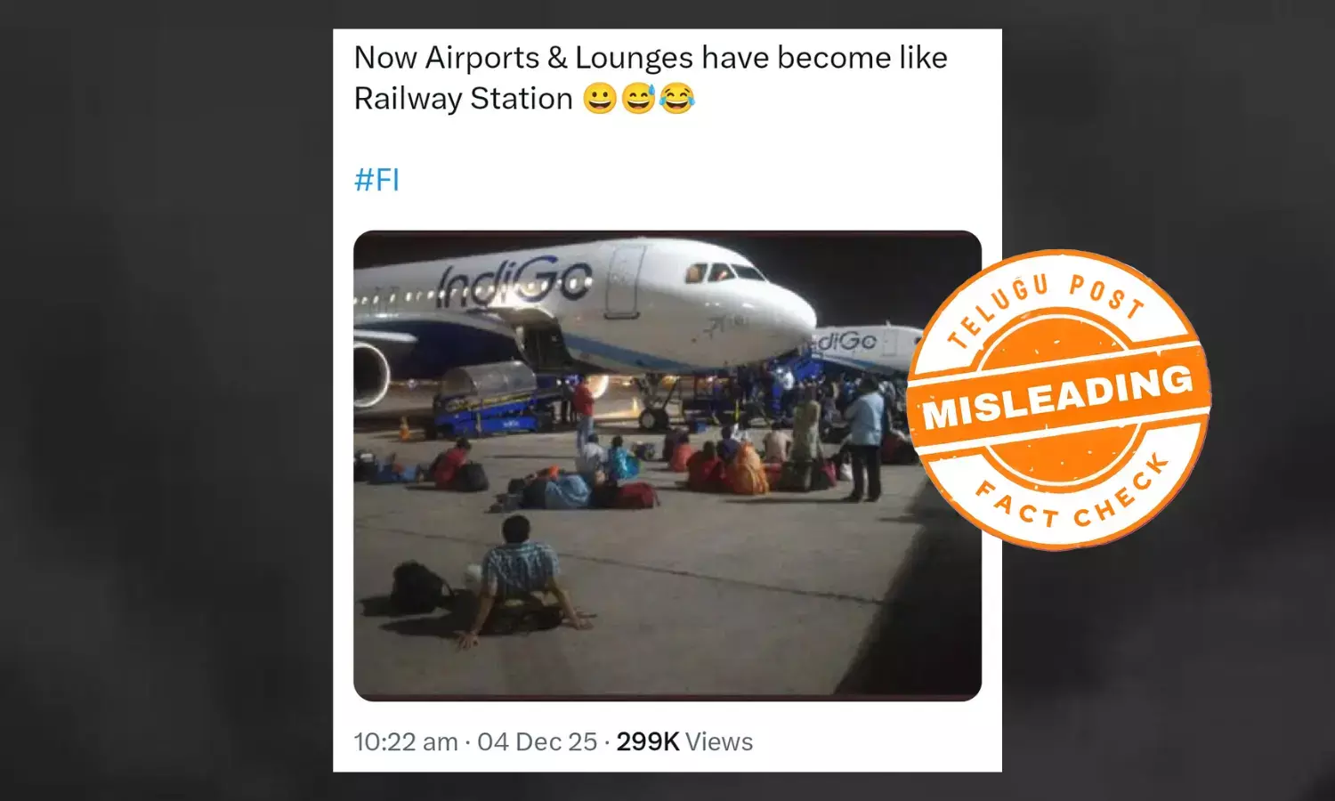 ଦାବିଟି ବିଭ୍ରାନ୍ତିକର ଅଟେ । ଭାଇରାଲ ହେଉଥିବା ଫଟୋଟି ୨୦୧୮ ମସିହାର ଅଟେ, ବର୍ତ୍ତମାନ ଜାରି ରହିଥିବା ଇଣ୍ଡିଗୋ ବିମାନ ସଙ୍କଟ ସହ ନାହିଁ କୌଣସି ସମ୍ପର୍କ ।
