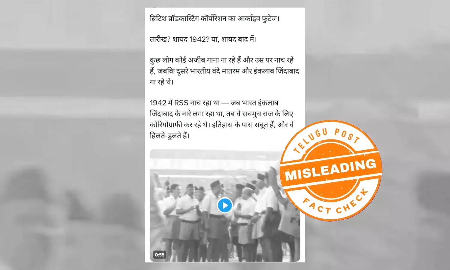 ଦାବିଟି ବିଭ୍ରାନ୍ତିକର ଅଟେ, ଆରଏସଏସ କର୍ମୀ ନାଚୁଥିବାର ଭିଡିଓଟି ୨୦୧୫ ମସିହାର ଅଟେ । ୧୯୪୨ ମସିହା କିମ୍ବା ବିବିସି ସହ ନାହିଁ କୌଣସି ସମ୍ପର୍କ ।