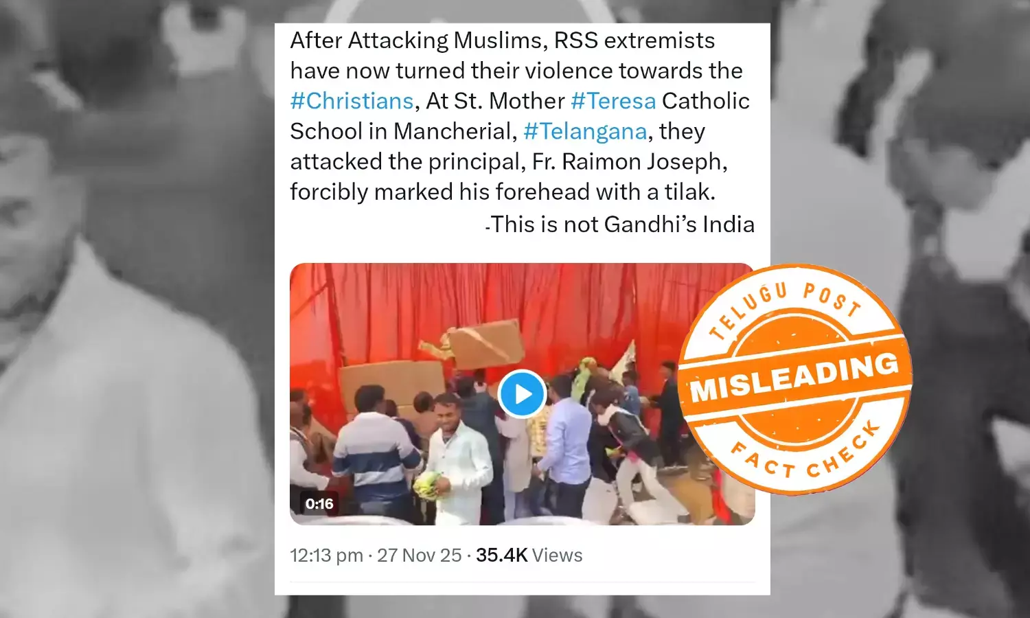 ସୋସିଆଲ ମିଡିଆରେ ଉକ୍ତ ଭିଡିଓ ସେୟାର କରି ୟୁଜର୍ସ ଉଲ୍ଲେଖ କରିଛନ୍ତି, "ମୁସଲମାନ ମାନଙ୍କୁ ଆକ୍ରମଣ କରିବା ପରେ, ଆରଏସଏସ ଉଗ୍ରବାଦୀମାନେ ଏବେ ଖ୍ରୀଷ୍ଟିଆନଙ୍କ ପ୍ରତି ସେମାନଙ୍କର ହିଂସା ମୁହାଁଇଛନ୍ତି। ତେଲେଙ୍ଗାନାର ମଞ୍ଚେରିଆଲରେ ଥିବା ସେଣ୍ଟ ମଦର ଟେରେସା କ୍ୟାଥୋଲିକ ସ୍କୁଲରେ, ସେମାନେ ପ୍ରିନ୍ସିପାଲ ଫାଦର ରାଇମନ ଜୋସେଫଙ୍କୁ ଆକ୍ରମଣ କରିଥିଲେ ଏବଂ ତାଙ୍କ କପାଳରେ ଜବରଦସ୍ତି ତିଳକ ଲଗାଇଥିଲେ । ତେବେ ଏହା ଗାନ୍ଧୀଙ୍କ ଭାରତ ନୁହେଁ ବୋଲି ପୋଷ୍ଟରେ ଦର୍ଶାଇଛନ୍ତି ୟୁଜର୍ସ ।