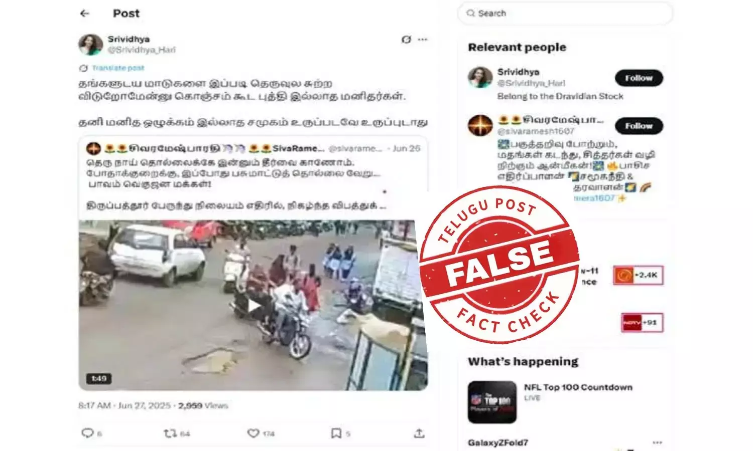 ஆனால் இந்த விபத்து காணொளி தெலுங்கு போஸ்ட் குழு ஆய்வு செய்தப்போது, இதுபோன்ற எந்த சம்பவமும் வேறு எந்த ஊடகத்திலும் செய்தியாக வெளிவரவில்லை என்பதனை உறுதிச் செய்ய முடிந்தது. இவை முற்றிலுமாக திரிக்கப்பட்ட போலிச் செய்தியாகும்.