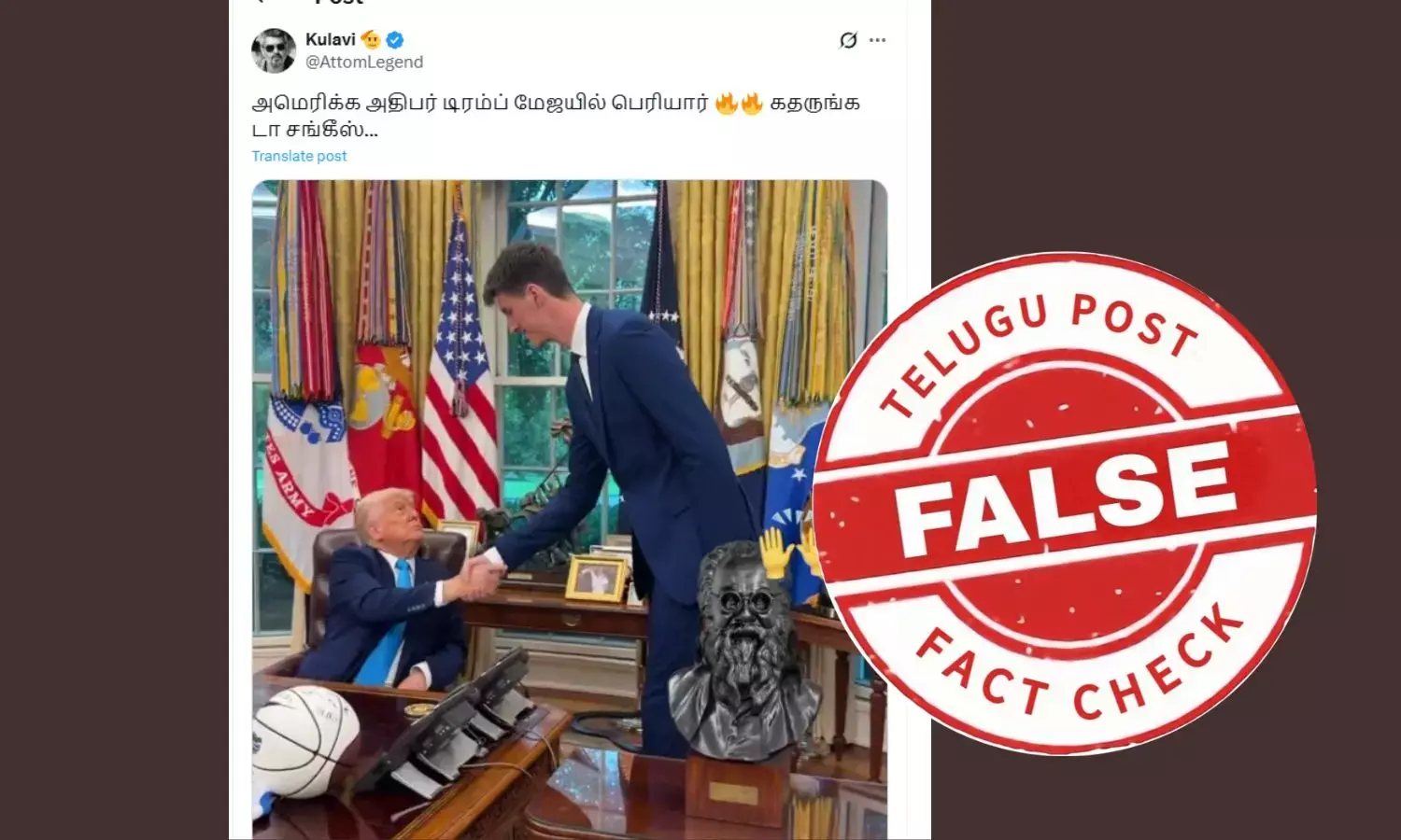 அமெரிக்க அதிபர் ட்ரம்ப் அலுவலக மேசையில் இருப்பது பெஞ்சமின் ப்ராங்க்ளின் சிலை என்பது தகுந்த ஆதாரங்களுடன் நிரூபிக்கப்பட்டுள்ளது. ஆனால், பெரியார் சிலை உள்ளதாக எடிட் செய்யப்பட்ட புகைப்படம் சமூக வலைதளங்களில் பரவி வருகிறது. ஆகவே, தகவல்களை பகிரும் முன்பு பகுப்பாய்வு செய்த பின்னர் வெளியிடும்படி TeluguPost உண்மை கண்டறியும் குழு வாசகர்களை கேட்டுக்கொள்கிறது.