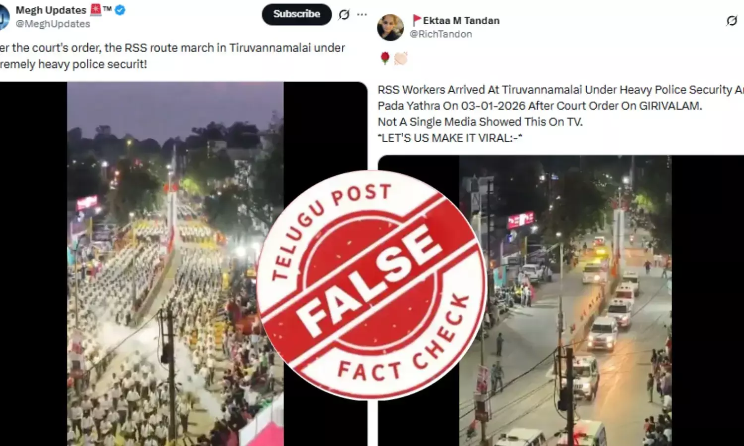 @MeghUpdates என்ற எக்ஸ் கணக்கில், “நீதிமன்ற உத்தரவுக்குப் பிறகு, திருவண்ணாமலையில் ஆர்.எஸ்.எஸ். பாதை அணிவகுப்பு மிகவும் பலத்த போலீஸ் பாதுகாப்பில்” என்று குறிப்பிட்டு இருந்தது. இந்த பதிவை 1.16 லட்சம் பேருக்கு ரீச் ஆன நிலையில், 9,300 பேர் லைக் செய்திருந்தனர்.