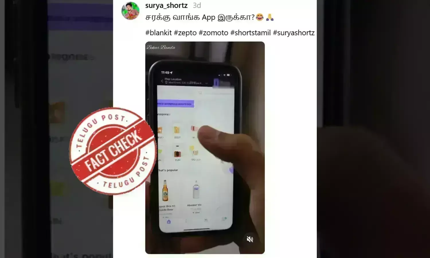 மேலும், அந்த வீடியோவில், தமிழ்நாட்டில் தனியார் நிறுவனத்தின் செயலியின் மூலம் ஆர்டர் செய்தால் வீட்டுக்கே மதுவைக் கொண்டு வந்து டெலிவரி செய்வதாக இன்ஸ்டாகிராம் தளத்தில் ஒரு காணொளி பரப்படுகிறது. தமிழ்நாட்டில் மதுபானங்களை வீடுகளுக்கு டெலிவரி செய்யும் நடைமுறைக்கு அனுமதியில்லை. இக்காணொளியில் வரும் செயலி மேற்கு வங்க மாநிலம் கொல்கத்தா நகரில் மட்டும் செயல்பாட்டில் உள்ளது. கொல்கத்தாவில் எடுக்கப்பட்ட காணொளியை தமிழ்நாடு என்று வதந்தி பரப்பி வருகின்றனர். வதந்தியைப் பரப்பாதீர்,” என பதிவு செய்யப்பட்டிருந்தது. தமிழ்நாடு அரசு உண்மை கண்டறியும் குழு வெளியிட்ட அந்த காணொளியைக் கீழே காணலாம்.