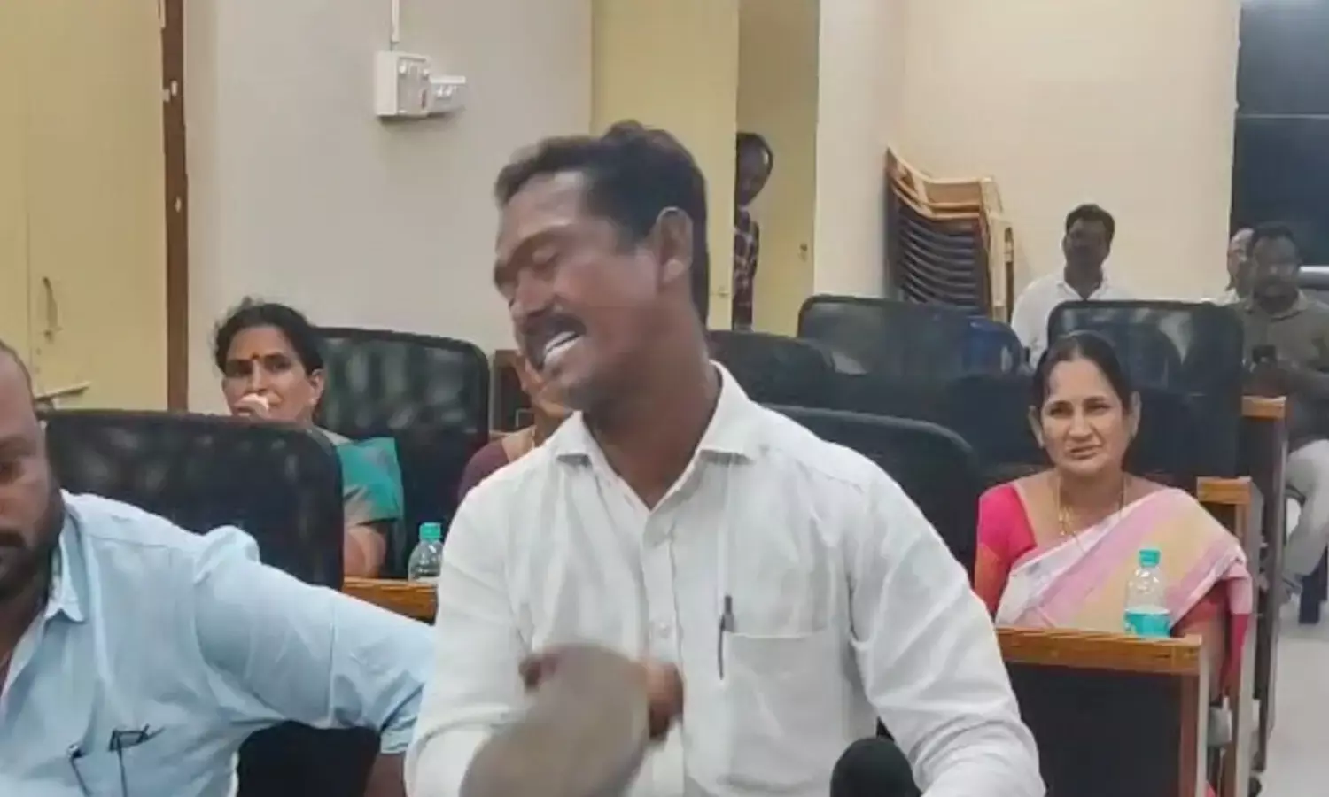 అనకాపల్లి జిల్లా నర్సీపట్నంలో మున్సిపల్ సమావేశం హాట్ టాపిక్ గా మారింది. అనకాపల్లి జిల్లా నర్సీపట్నం మున్సిపాలిటీలో ఓ కౌన్సిలర్ సోమవారం తన ఓటర్లకు ఇచ్చిన హామీలను నెరవేర్చలేకపోతున్నానని చెప్పుతో కొట్టుకున్నాడు. సోమవారం జరిగిన కౌన్సిల్ సమావేశంలో వార్డు నెంబర్ 20 కౌన్సిలర్ ఎం రామరాజు ఆవేదన వ్యక్తం చేశారు. విపక్ష సభ్యుడిని కావడం వల్లే తన ప్రాంత అభివృద్ధికి సహకరించడం లేదంటూ ఆవేదన వ్యక్తం చేశాడు టీడీపీ కౌన్సిలర్ రామరాజు. ఏం చేయాలో తెలియక సమావేశ మందిరంలోనే చెప్పుతో తనను తాను కొట్టుకున్నాడు.