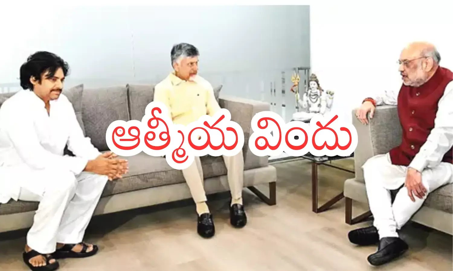 అమిత్ షా దాదాపు రెండు గంటల పాటు ఉండవల్లిలోని అమిత్ షా నివాసంలో గడిపారు. ఈ సంందర్భంగా అందరితో కలసి విందు చేశారు. అరటి ఆకులో భోజనం పెట్టిన వారిని చూసి ఇదేమిటని అడగ్గా ఇది తమ సంప్రదాయమని చంద్రబాబు వివరించారు. ఇదే సమయంలో ఇక్కడ భూముల ధరలు ఎలా ఉన్నాయి? అని కూడా అమిత్ షా ప్రశ్నించారు. అయితే రాష్ట్ర విభజన జరిగిన తర్వాత హైదరాబాద్ లో భూమి విలువ పెరిగిందని, ఇక్కడ విలువ తగ్గిందని, విభజనకు ముందున్న పరిస్థితులు ఇప్పుడు లేవని ఆయన చెప్పినట్లు తెలిసింది. అదే సమయంలో విశాఖ స్టీల్ ప్లాంట్ కు ఆర్ధిక ప్యాకేజీని ప్రకటించడంపై కూడా పవన్ కల్యాణ్ కృతజ్ఞతలు తెలపగా, దానిన కాపాడుకోవాల్సిన ధర్మం అందరిపైనా ఉందని అన్నట్లు తెలిసింది.