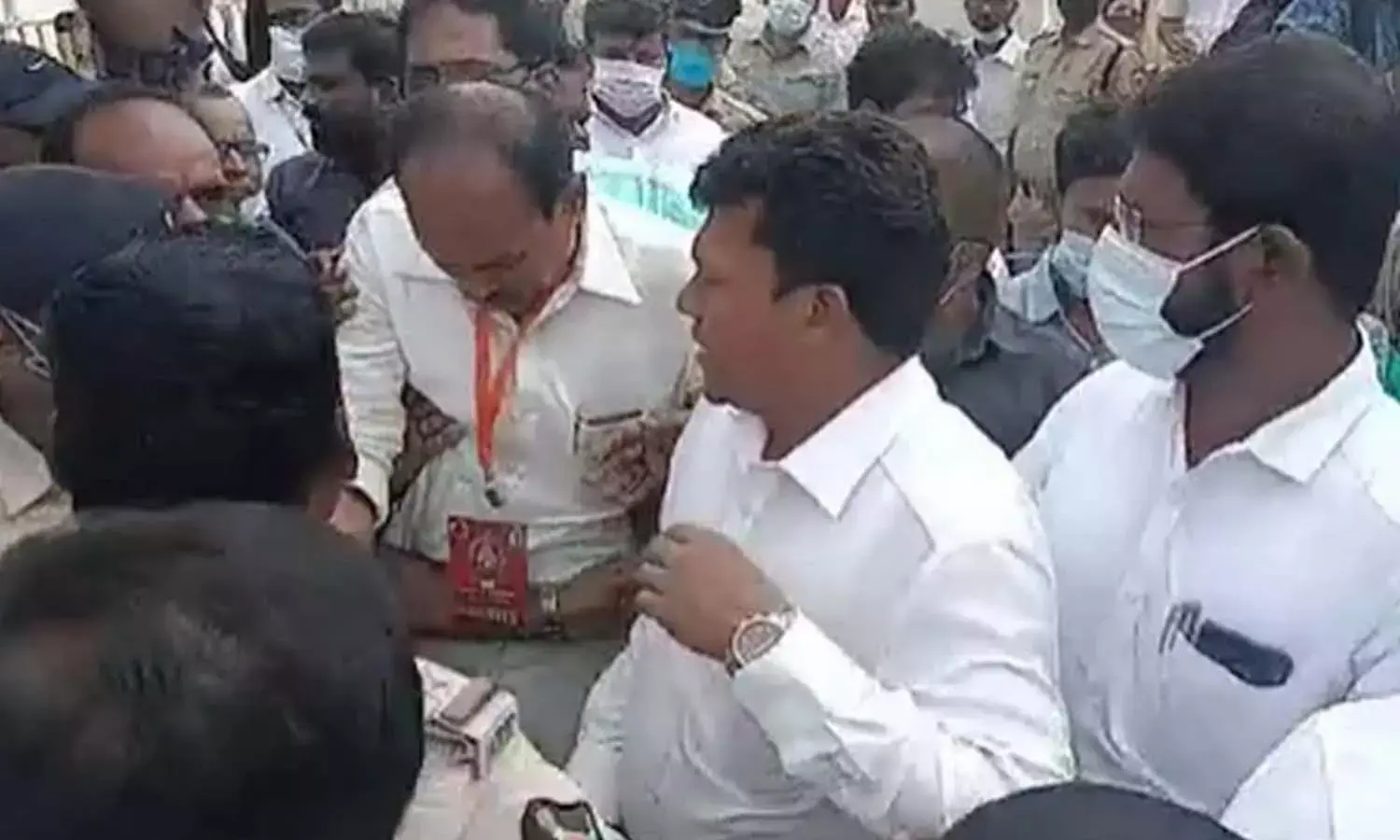 తనతో పాటు నలుగురు మాత్రమే లోపలకి వస్తారని మంత్రి అప్పలరాజు సర్దిచెప్పే ప్రయత్నం చేశారు. అయితే మంత్రికి మాత్రమే అనుమతి ఉందని మరెవ్వరికీ అనుమతి లేదని అక్కడ సీఐ తేల్చి చెప్పారు. ఈ సందర్బంగా మంత్రికి, సీఐకి మధ్య కొంత వాగ్వాదం జరిగింది. పోలీసులకు మంత్రి ఎంత నచ్చ చెప్పేందుకు ప్రయత్నించినా ఫలితం లేకుండా పోయింది.