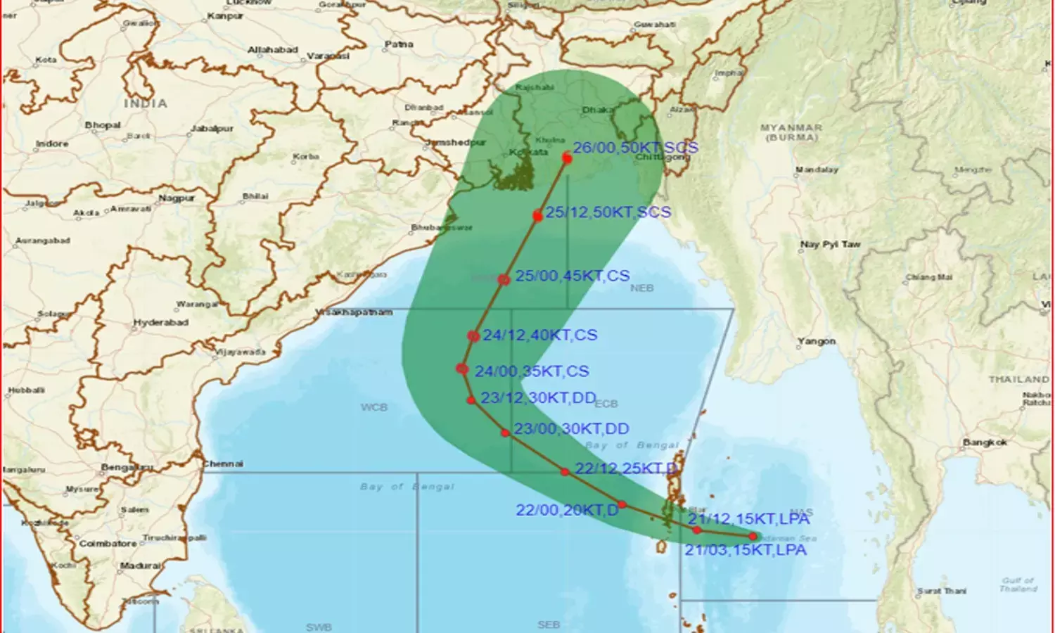 రానున్న 48 గంటల్లో నైరుతి రుతుపవనాలు దేశం మొత్తం నుంచి వెళ్లిపోయే అవకాశం ఉందని భారత వాతావరణ విభాగం (ఐఎండీ) తెలిపింది. అంతేకాకుండా ఆంధ్రప్రదేశ్ కు తుఫాను ముప్పు తప్పింది. ఉత్తర అండమాన్ సముద్రంలో ఏర్పడిన అల్పపీడనం తుఫానుగా బలపడి అక్టోబర్ 25న పశ్చిమ బెంగాల్-బంగ్లాదేశ్ తీరాలను తాకుతుందని, దీనివల్ల గంటకు 110 కి.మీ వేగంతో గాలులు వీచే అవకాశం ఉందని భారత వాతావరణ శాఖ (ఐఎండీ) శుక్రవారం తెలిపింది. ఉత్తర అండమాన్ సముద్రంలో ఉపరితల ఆవర్తనం పశ్చిమ-వాయువ్య దిశగా కదిలి అక్టోబరు 23న అల్పపీడనంగా, ఆపై బలమైన అల్పపీడనంగా మారే అవకాశం ఉంది. అక్టోబరు 24నాటికి అల్పపీడనం ఉత్తరంవైపు తిరిగి పశ్చిమ మధ్య ఆనుకుని ఉన్న తూర్పు మధ్య బంగాళాఖాతంపై తుఫానుగా మారే అవకాశం ఉందని వాతావరణ శాఖ తెలిపింది. ఆ తర్వాత ఇది ఉత్తర-ఈశాన్య దిశగా పయనించి అక్టోబర్ 25న ఒడిశా తీరాన్ని దాటి పశ్చిమ బెంగాల్-బంగ్లాదేశ్ తీరాలకు చేరుకునే అవకాశం ఉందని వాతావరణ శాఖ అంచనా వేస్తోంది.