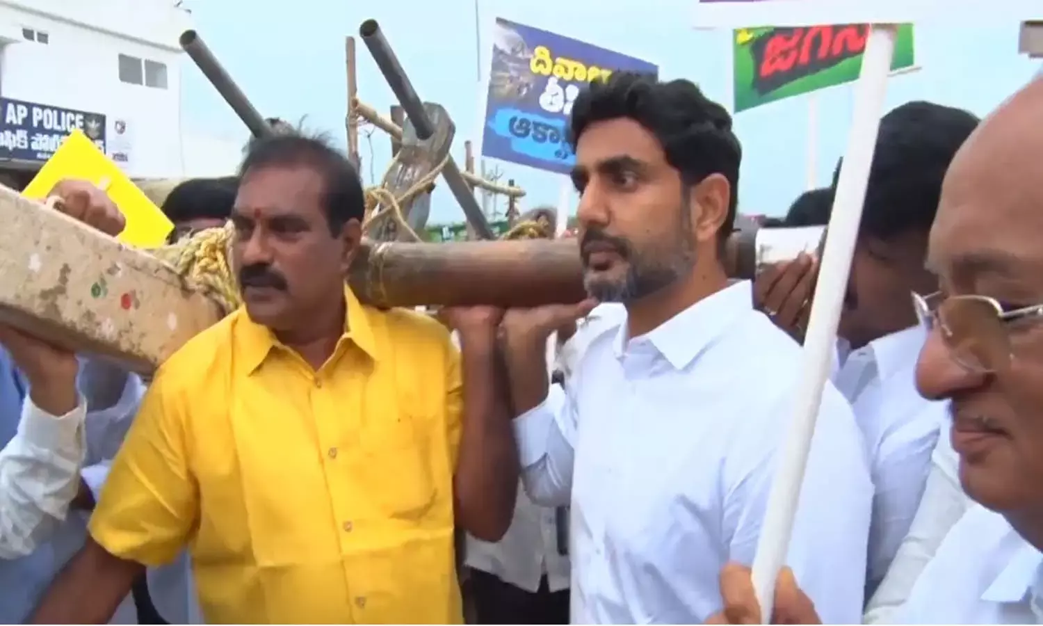 నారాలోకేష్ ఆధ్వర్యంలో ఎడ్లబండి కాడె మోస్తూ నిరసన తెలిపారు. ఈ నిరసన కార్యక్రమంలో ఎమ్మెల్యేలు, ఎమ్మెల్సీలు పాల్గొన్నారు.