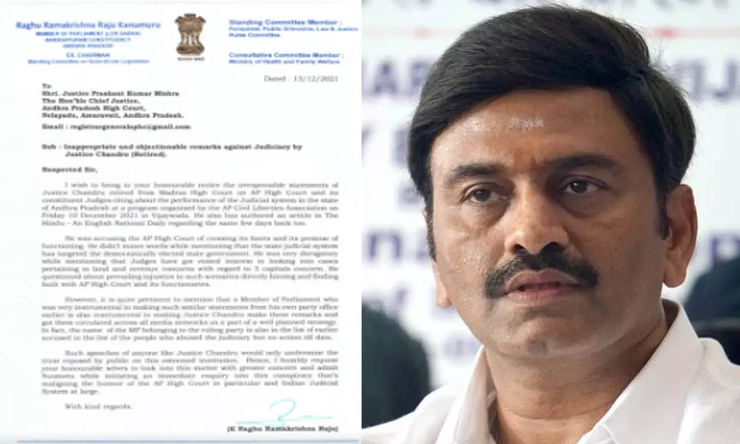 వైసీపీ రెబల్ ఎంపీ రఘురామ కృష్ణరాజు ఏపీ హైకోర్టు చీఫ్ జస్టిస్ కు లేఖ రాశారు. తన లేఖను సుమోటాగా తీసుకుని విచారణ జరిపించాలని కోరారు. మద్రాస్ హైకోర్టు మాజీ జస్టిస్ చంద్రు చేసిన వ్యాఖ్యలపై రఘురామ కృష్ణరాజు అభ్యంతరం వ్యక్తం చేశారు. న్యాయవ్యవస్థను కించపర్చేలా ఆయన వ్యాఖ్యలు ఉన్నాయని పేర్కొన్నారు. ఏపీ ప్రభుత్వానికి, న్యాయవ్యవస్థకు మధ్య ఉన్న అంతరాన్ని ఆయన ప్రశ్నించారన్నారు.