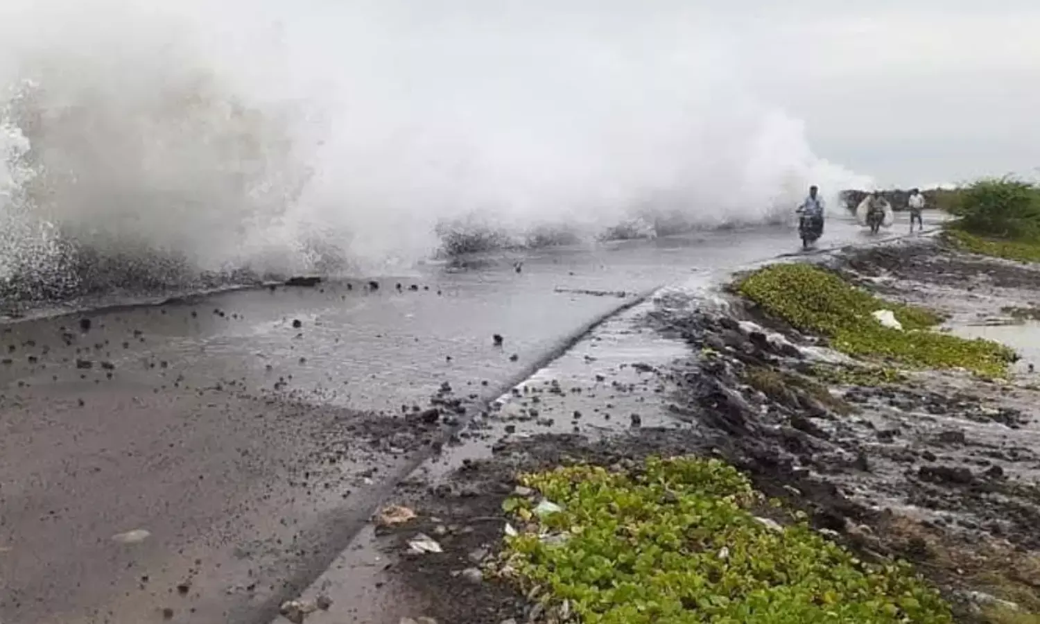 కాకినాడ జిల్లా కొత్తపల్లి మండలం మాయపట్నం వద్ద సముద్రపు అలలు ఎగిసిపడుతున్నాయి. భారీ వర్షాలు, అల్పపీడనం కారణంగా సముద్రపు నీరు గ్రామాల్లోకి చేరుతోంది. భారీ కెరటాలతో మాయాపట్నం గ్రామం జలమయమయింది. ఇళ్లలోకి సముద్రపు నీటి చేరికతో స్థానికంగా నివసించే ప్రజలు బయటికి రాలేకపోతున్నారు.