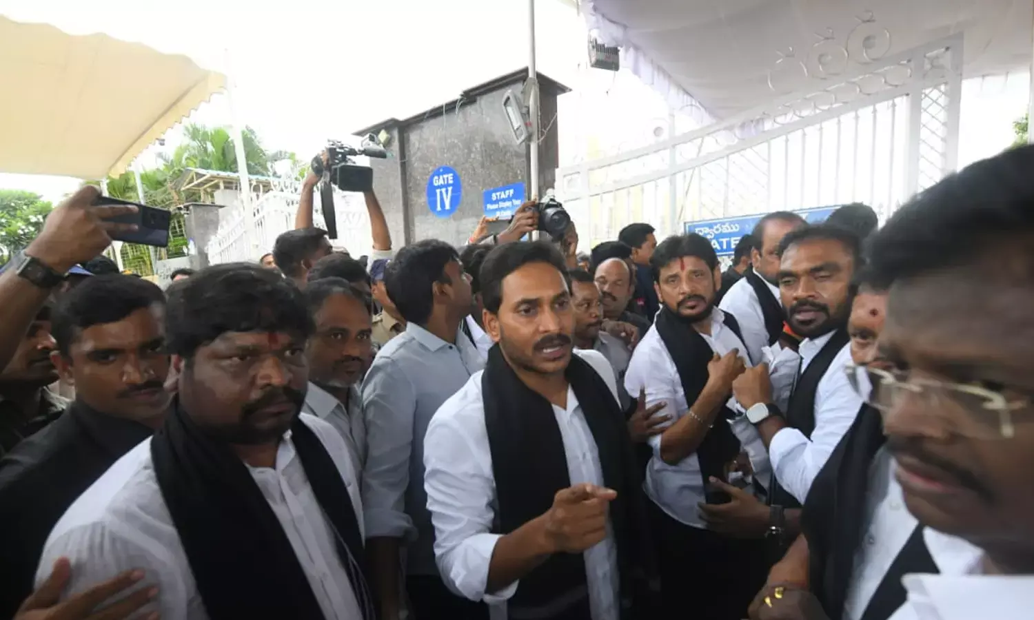 మాజీ ముఖ్యమంత్రి వైఎస్ జగన్ మెడలో నల్ల కండువాలు ధరించి అసెంబ్లీకి హాజరయ్యారు. వైఎస్సార్పీపీ ఎమ్మెల్యేలు, ఎమ్మెల్సీలు. ‘సేవ్ డెమొక్రసీ’ అని నినాదాలు చేస్తూ, అసెంబ్లీ ప్రాంగణంలోకి వచ్చారు. ఎమ్మెల్యేలు, ఎమ్మెల్సీలను అసెంబ్లీ గేటు వద్ద పోలీసులు అడ్డుకున్నారు. వారి చేతుల్లో ఉన్న ప్లకార్డులు, పేపర్లు లాక్కుని పోలీసులు చింపేశారు. పోలీసుల తీరుపై వైఎస్ జగన్ తీవ్ర ఆగ్రహం వ్యక్తం చేశారు.. ఆ అధికారం ఎవరిచ్చారంటూ.. గట్టిగా పోలీసులను నిలదీశారు.