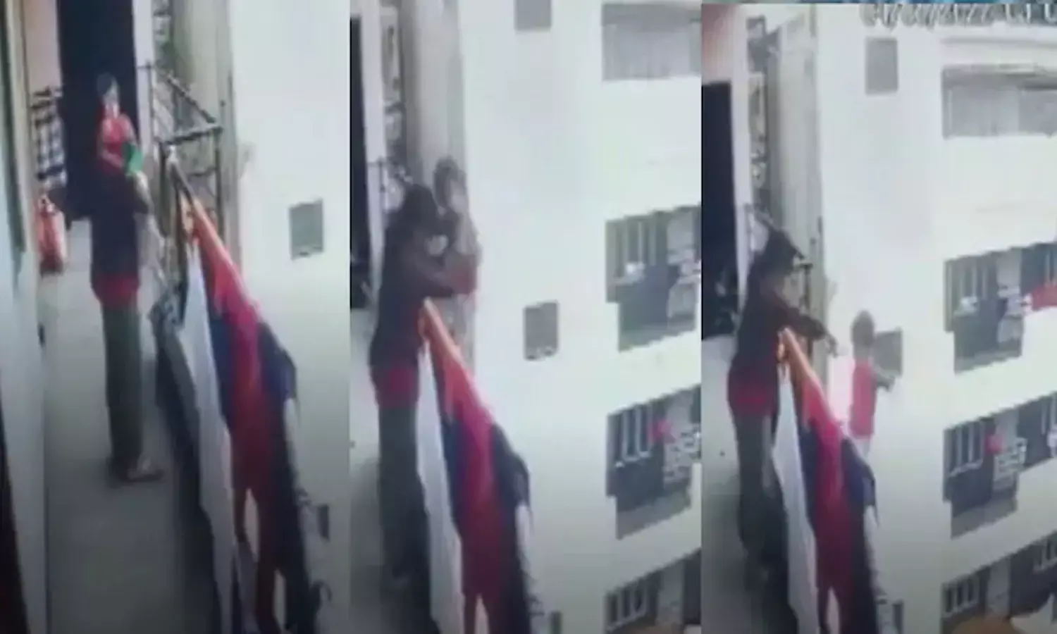 అపార్ట్మెంట్లోని 4వ అంతస్తు కారిడార్లో తల్లి బిడ్డతో కలిసి నడుస్తూ కనిపించింది.