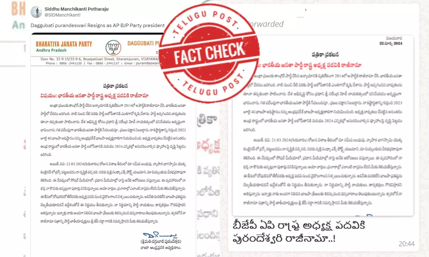 After these allegations, a letter on the letterhead of Mrs. Daggubati Purandeswari, Bharatiya Janata Party, Andhra Pradesh went viral on social media platforms including WhatsApp, claiming that she resigned as party president.
