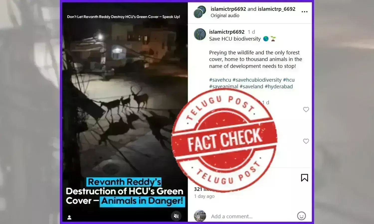 The users are sharing a video showing 3 deers walking in a street at night time with text embedded on the video “Don’t let Revanth Reddy destroy HCU’s Green Cover- Speak up”. “Revanth reddy’s Destruction of HCU’s Green cover – Animals in Danger”. Some users shared this video with caption: “Save HCU biodiversity Preying the wildlife and the only forest cover, home to thousand animals in the name of development needs to stop! #savehcu #savehcubiodiversity #hcu #saveanimal #saveland #hyderabad”