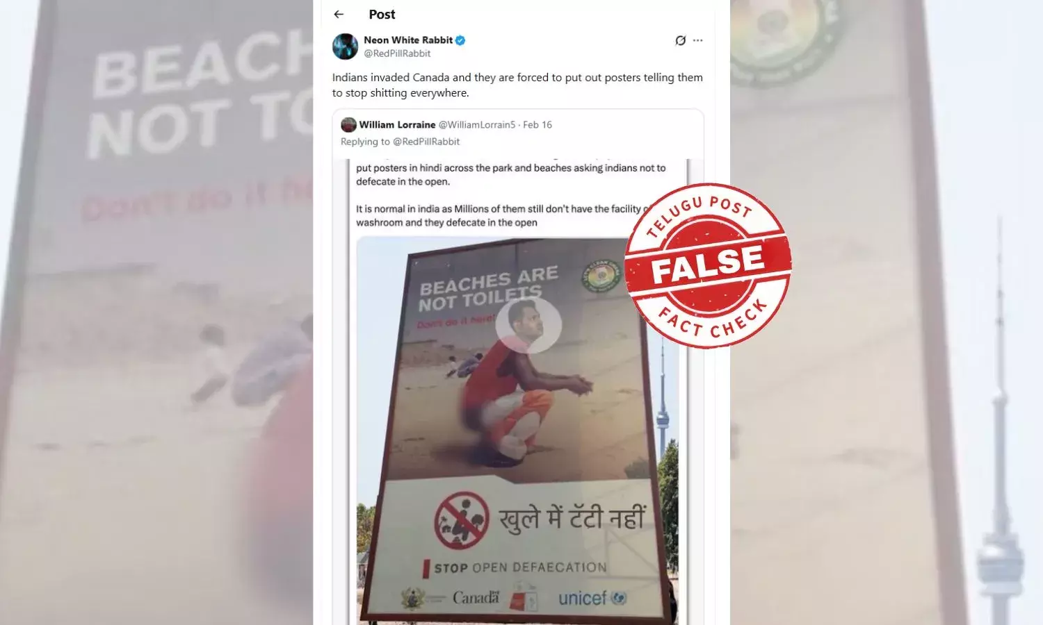 An image of a billboard featuring men defecating in the open, alongside the message “Beaches are not toilets,” is circulating widely on social media. The billboard also displays a government logo and the UNICEF emblem along with the government of Canada mark. The post sharing this image claims that the Canadian government has installed such posters in municipalities with large Indian populations, urging Indians not to engage in open defecation. Here's the screenshot of the claim.
