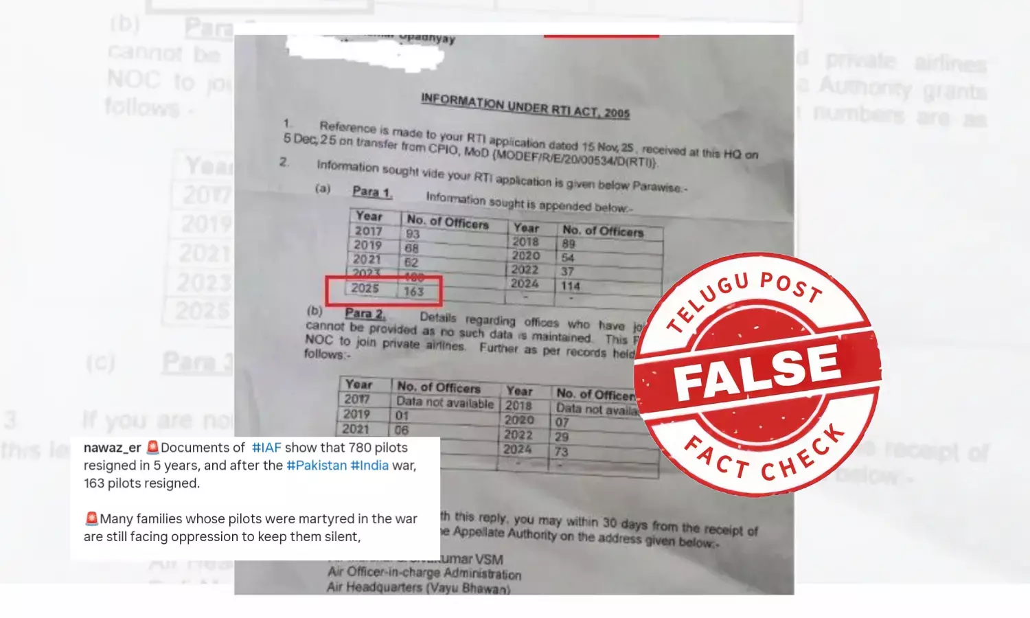 India Today mentioned, “Photoshopped RTI peddles FAKE claim that IAF pilots are quitting after Op Sindoor.” The original RTI response was obtained by India Today in 2020.