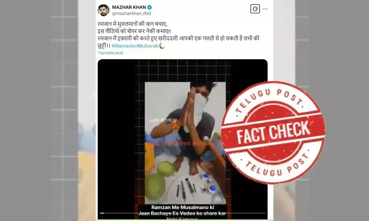 Amidst this, a video of a person trying to adulterate a watermelon fruit is going viral on social media with the captions implying that the fruit vendor is adulterating watermelon right during the period of Ramzan to affect the Muslim community. The caption on the video goes as “ Save the lives of Muslims in Ramadan , earn good deeds by sharing this video !! While shopping for Iftaari in Ramadan , one mistake of yours can ruin everyone . #Ramadan #RamadanKareem # Ramadan2025”. When translated, it claims “Save the lives of Muslims in Ramadan, Earn goodness by sharing this video!! While shopping for Iftaar in Ramadan, one mistake of yours can result in everyone's loss.”