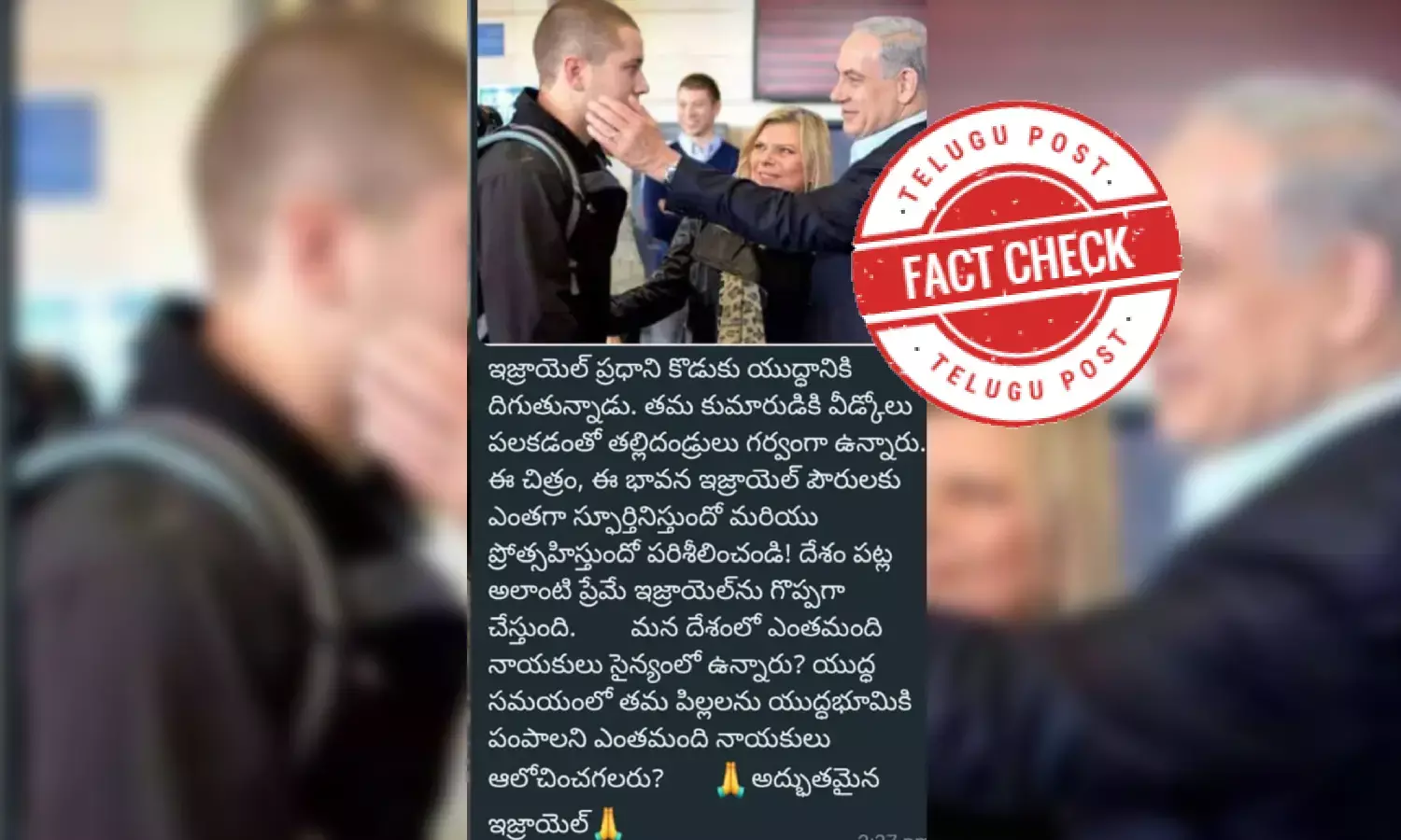 The claim in Telugu goes as “ఇజ్రాయెల్ ప్రధాని కొడుకు యుద్ధానికి దిగుతున్నాడు. తమ కుమారుడికి వీడ్కోలు పలకడంతో తల్లిదండ్రులు గర్వంగా ఉన్నారు. ఈ చిత్రం, ఈ భావన ఇజ్రాయెల్ పౌరులకు ఎంతగా స్ఫూర్తినిస్తుందో మరియు ప్రోత్సహిస్తుందో పరిశీలించండి! దేశం పట్ల అలాంటి ప్రేమే ఇజ్రాయెల్ను గొప్పగా చేస్తుంది. మన దేశంలో ఎంతమంది నాయకులు సైన్యంలో ఉన్నారు? యుద్ధ సమయంలో తమ పిల్లలను యుద్ధభూమికి పంపాలని ఎంతమంది నాయకులు ఆలోచించగలరు? " అద్భుతమైన ఇజ్రాయెల్”