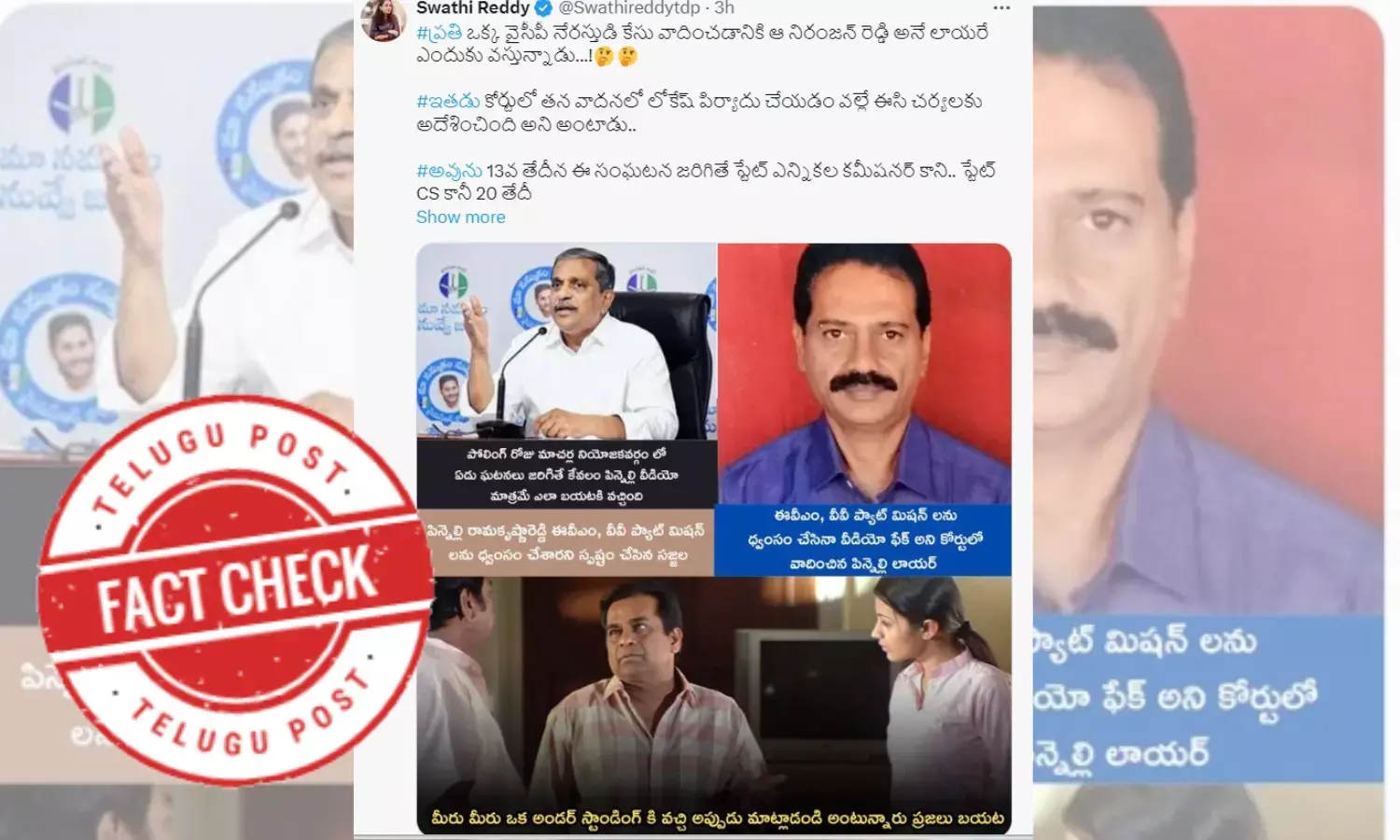 Meanwhile, a collage of images is in circulation on social media claiming that one of the images is the picture of the counsel of Pinnelli Ramakrishna Reddy. Surprisingly, these images show the editor of Telugupost.com. The collage of images also feature Sajjala Ramakrishna Reddy, advisor to the Andhra Pradesh Government in white shirt and another image of Srinivasa Ravi Batchali, Editor of Telugupost.com,