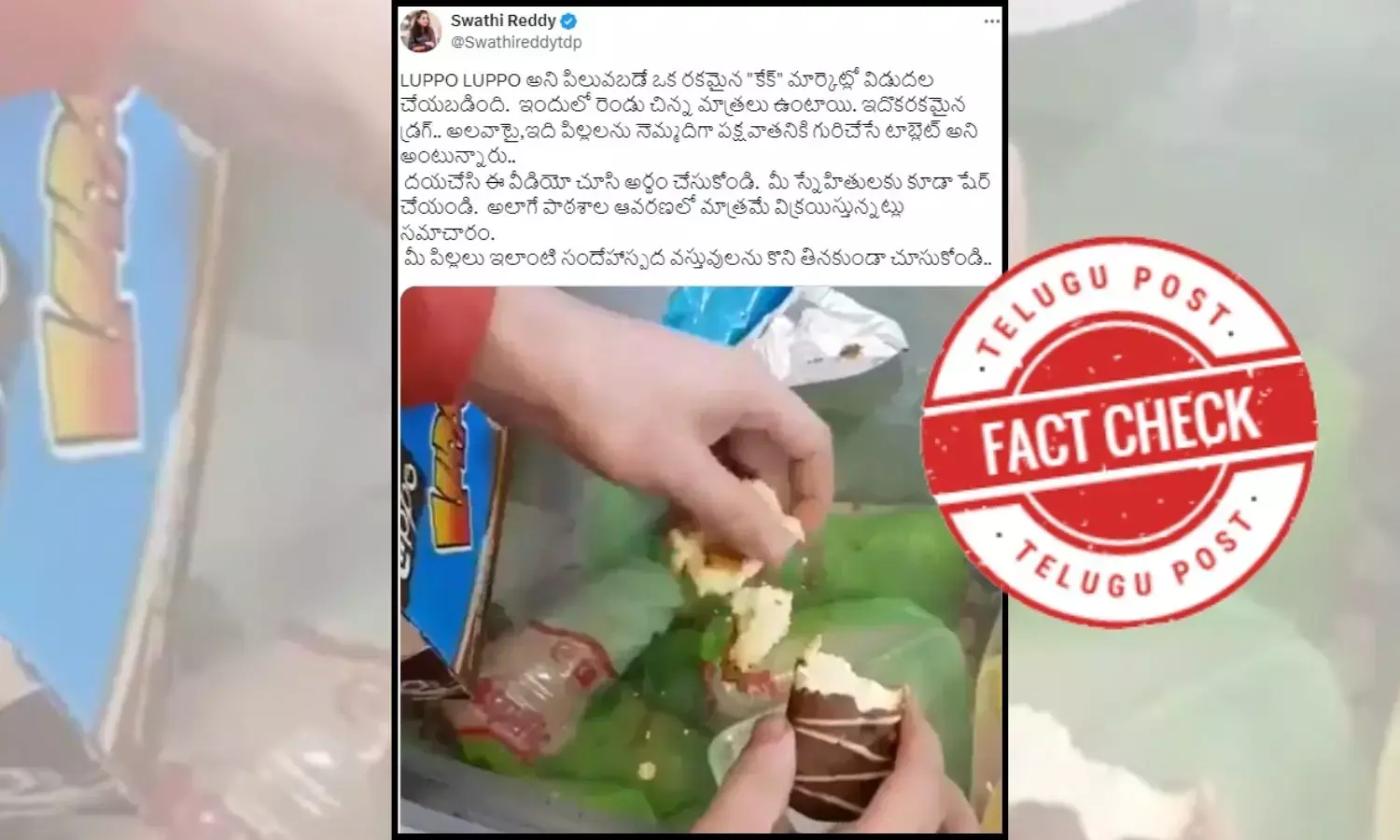 Right after this news spread online, a video of a person opening a packed cake and finding two white pills in it went viral with the claim that the cake called Luppo was new in the market. These cakes contain pills that cause slow paralysis in children. The claim in Telugu goes :“LUPPO అని పిలువబడే ఒక రకమైన "కేక్" మార్కెట్లో విడుదల చేయబడింది. ఇందులో రెండు చిన్న మాత్రలు ఉంటాయి. ఇదొకరకమైన డ్రగ్.. అలవాటై,ఇది పిల్లలను నెమ్మదిగా పక్షవాతనికి గురిచేసే టాబ్లెట్ అని అంటున్నారు. దయచేసి ఈ వీడియో చూసి అర్థం చేసుకోండి. మీ స్నేహితులకు కూడా షేర్ చేయండి. అలాగే పాఠశాల ఆవరణలో మాత్రమే విక్రయిస్తున్నట్లు సమాచారం. మీ పిల్లలు ఇలాంటి సందేహాస్పద వస్తువులను కొని తినకుండా చూసుకోండి.”