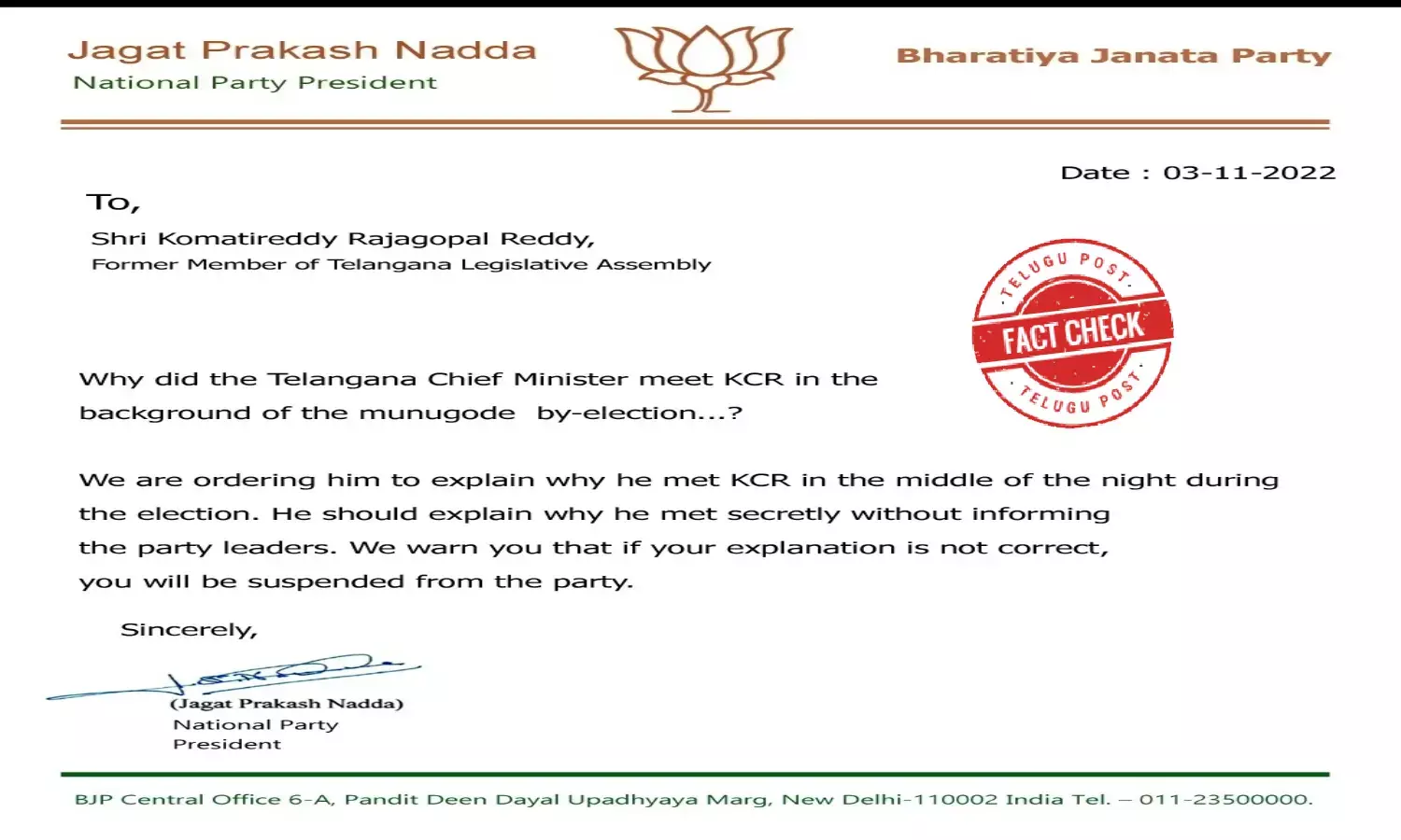 Hyderabad: Amid the political frenzy over Munugoda bypoll, a letter is viral on social media with the claim that it has been allegedly written by BJP National President Jagat Prakash Nadda, addressed to former MLA of Telangana Komatireddy Rajgopal Reddy questioning him on meeting Telangana Chief Minister K. Chandrasekhar Rao without informing his party leaders during the election.