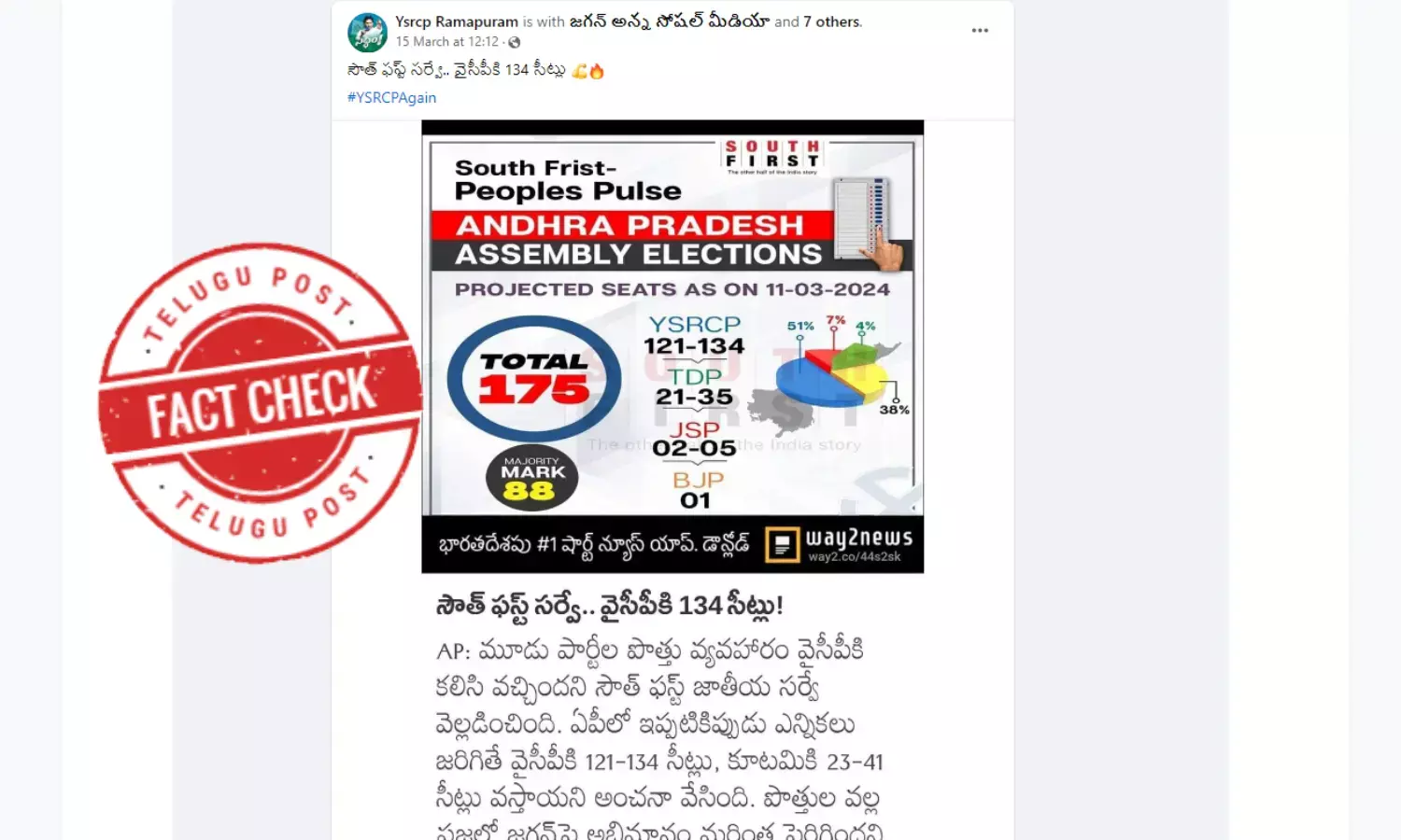 Therefore, the claim is False. South First did not conduct any survey relating to the Andhra Pradesh assembly election results predicting the victory of the YSRC party. The graphic shared is an edited one.