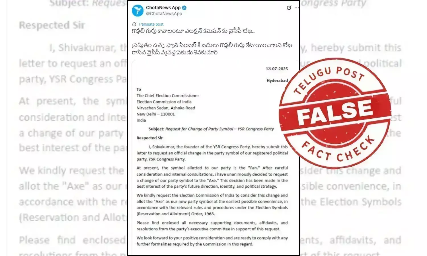 Meanwhile, an image showing a letter addressed to the Chief Election Commissioner of India is going viral on social media, especially in Telugu-speaking states, with the claim that the founder of the YSR Congress Party is requesting the Election Commission to change the party symbol from ‘Fan’ to ‘Axe’.