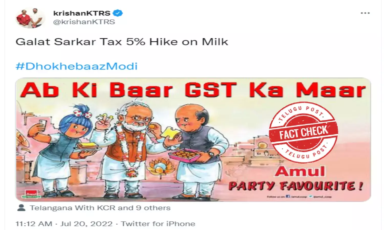 Telangana Rashtra Samiti (TRS) MLA Gandra Venkatramana Reddy shared an image of an advertisement showing an Amul girl taking a selfie with politicians with a huge text caption 'Ab ki Baar GST ka maar'. This was shared by the MLA with the comment "Galat Sarkar Tax 5% hike on milk #dhokhebaazModi"