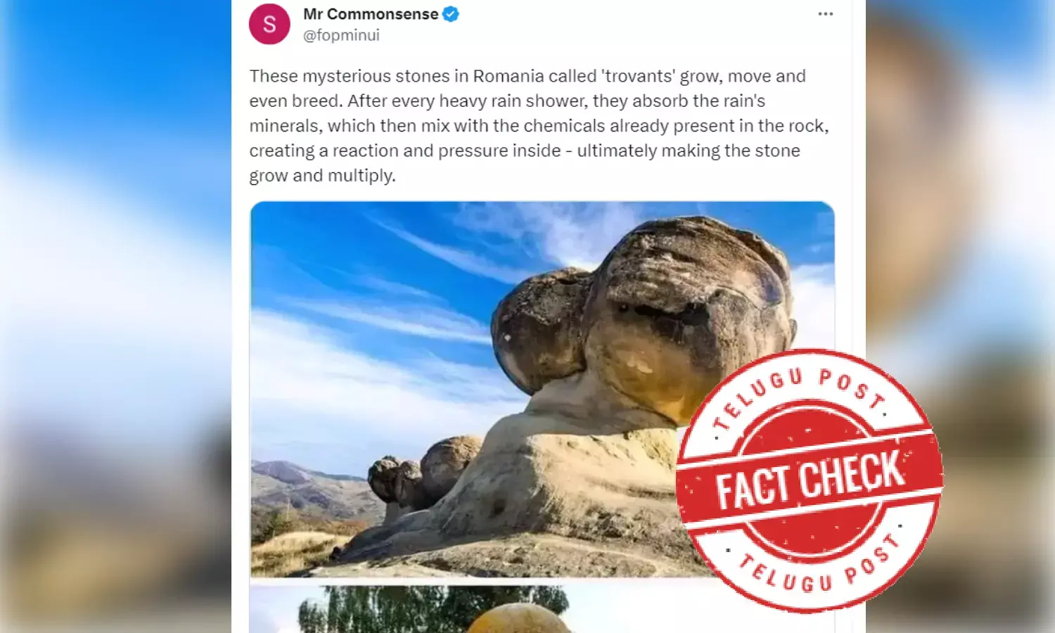 The claim shared goes: “These mysterious stones in Romania called 'trovants' grow, move, and even breed. After every heavy rain shower, they absorb the rain's minerals, which then mix with the chemicals already present in the rock, creating a reaction and pressure inside - ultimately making the stone grow and multiply.”