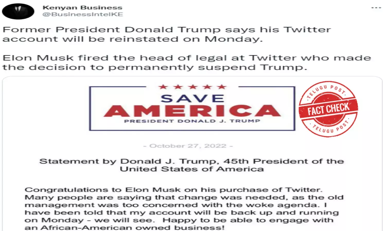 After the news of the takeover broke out, a screenshot claiming to be a statement by former American President Donald Trump on the acquisition of Twitter was widely shared on various social media platforms like Twitter and Facebook.