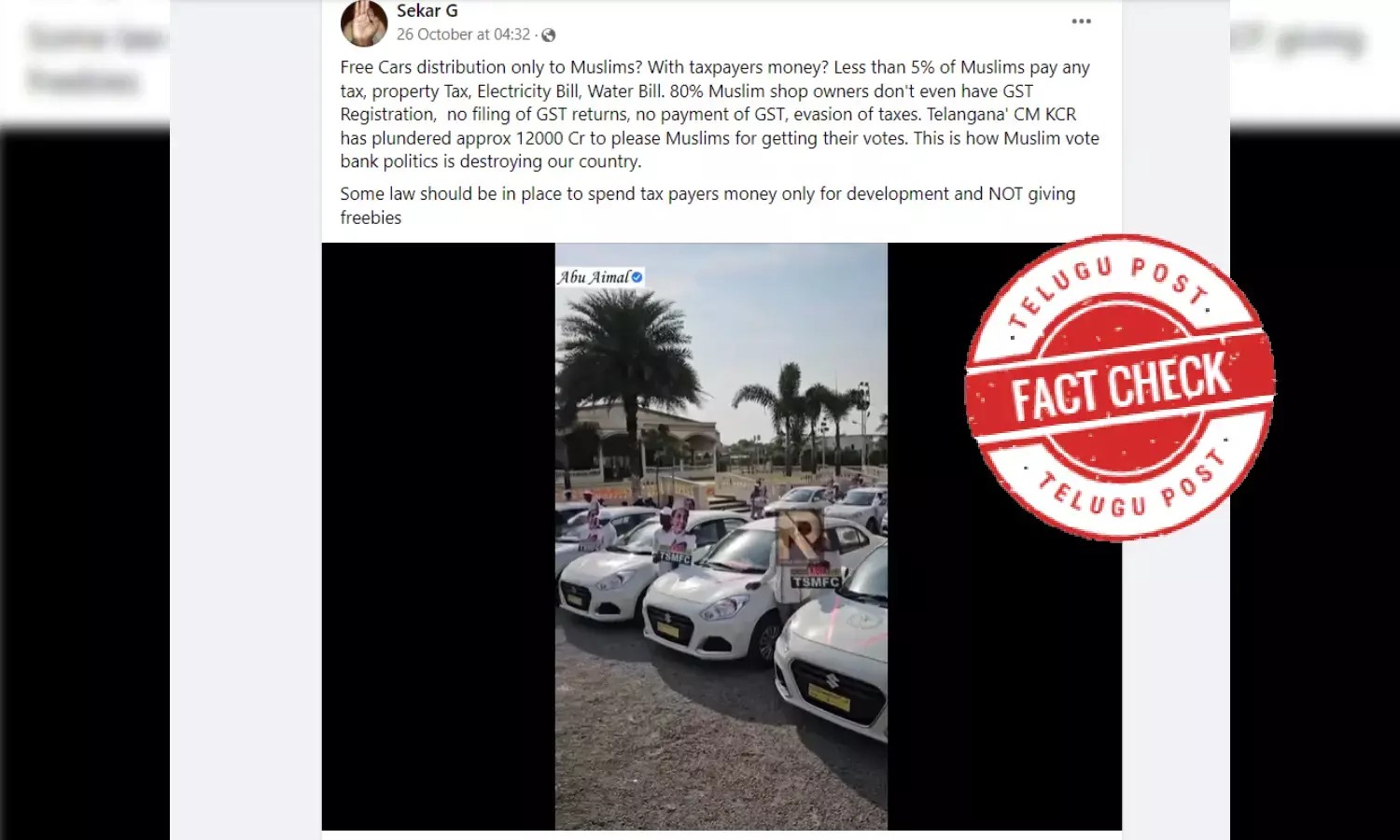 The claim goes as “Free Cars distribution only to Muslims? With taxpayer's money? Less than 5% of Muslims pay any tax, property Tax, Electricity Bill, or Water Bill. 80% of Muslim shop owners don't even have GST Registration, no filing of GST returns, no payment of GST, and evasion of taxes. Telangana's CM KCR has plundered approx 12000 Cr to please Muslims to get their votes. This is how Muslim vote bank politics is destroying our country.