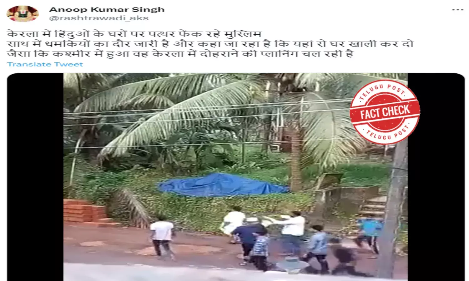The video is being shared with the caption, "Muslims throwing stones on Hindu bungalows in Kerala threatening them to vacate, same like Kashmir model. This has become common in Kerala. Rahul, Nitish, Akhilesh love them the most because they think they are peace loving, lovable, innocent minorities who tortured by Hindus."