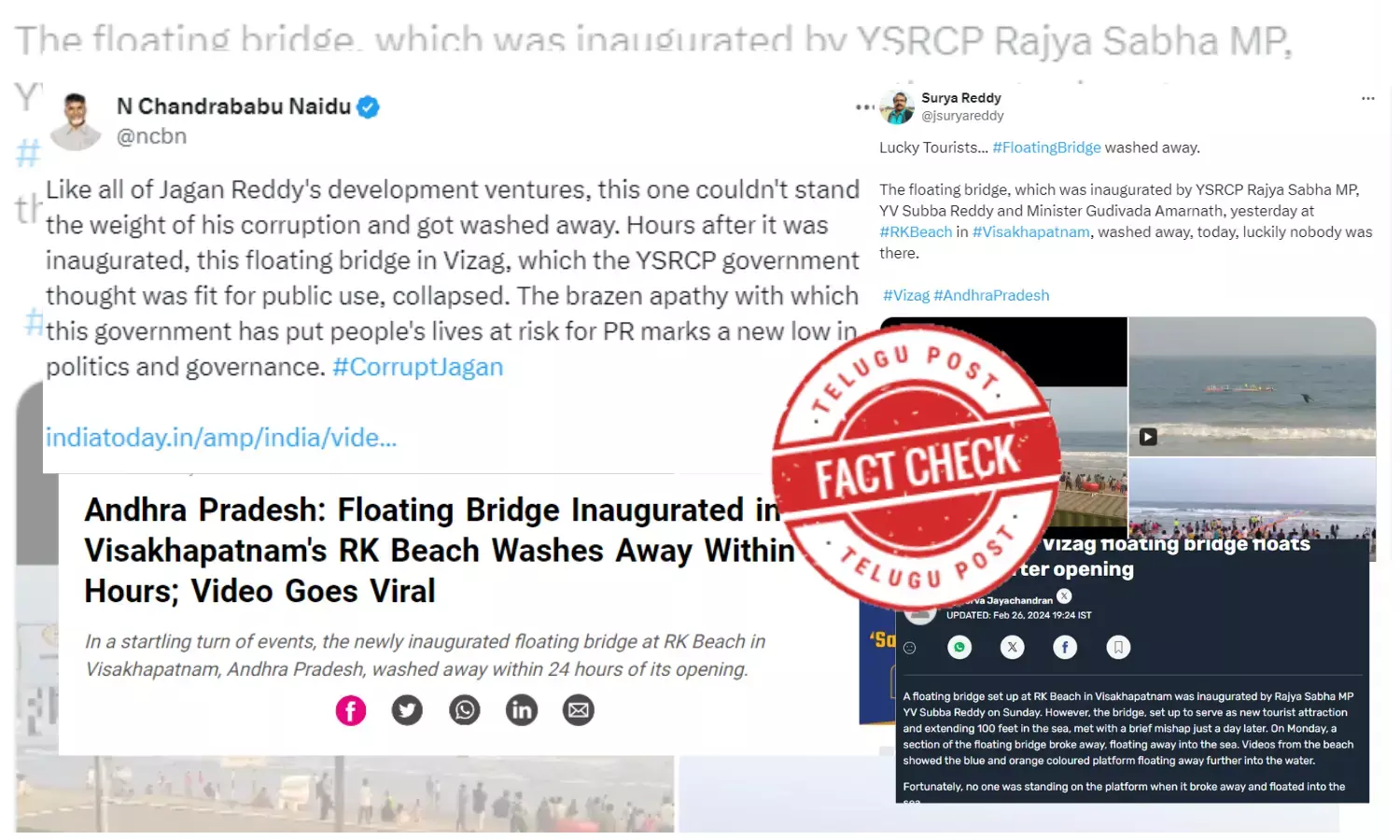 A video is circulating on social media claiming that a section of the same bridge separated on the second day of its inauguration. Chandrababu Naidu, the opposition leader of Andhra Pradesh, shared a link in an India Today story, accompanied by a caption stating, "Similar to many of Jagan Reddy's development projects, this one succumbed to the weight of corruption and collapsed. Shortly after its inauguration, the floating bridge in Vizag, deemed suitable for public use by the YSRC government, suffered a failure. The blatant disregard this government has shown for people's safety in pursuit of public relations sets a disturbing precedent in politics and governance. #CorruptJagan."